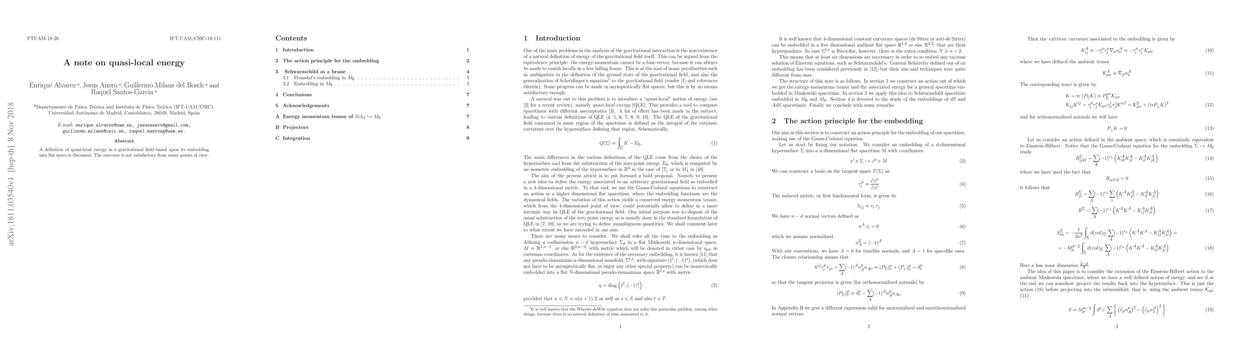 A definition of quasi-local energy in a gravitational field based upon its embedding into flat space is discussed. The outcome is not satisfactory from many points of view.