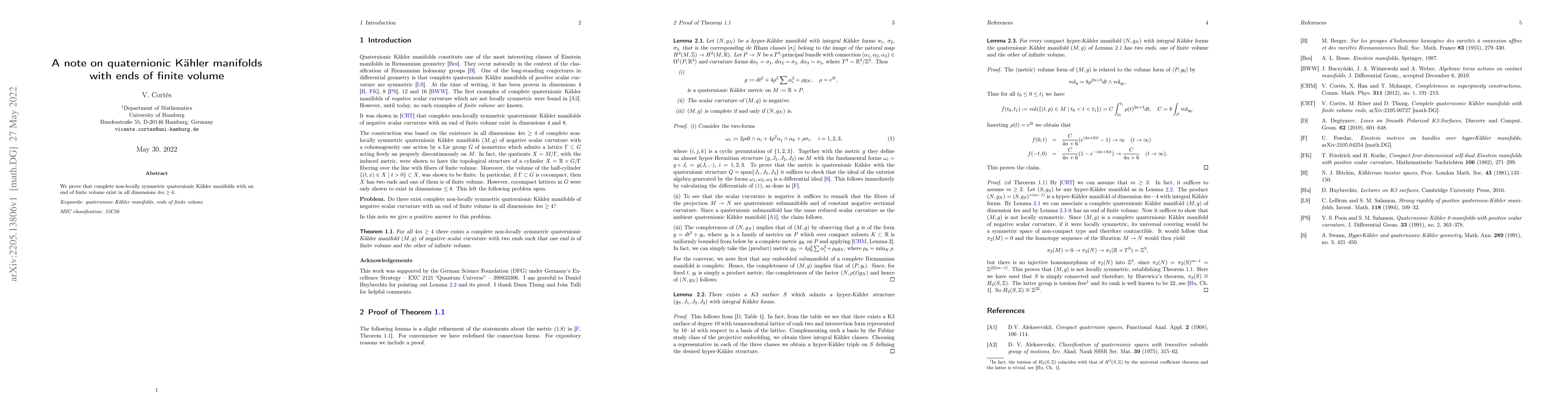 Summary: The paper demonstrates the existence of complete, non-locally symmetric quaternionic Kähler manifolds with finite volume ends in dimensions $4m \ge 4$. This finding extends the understanding of such complex geometric structures.