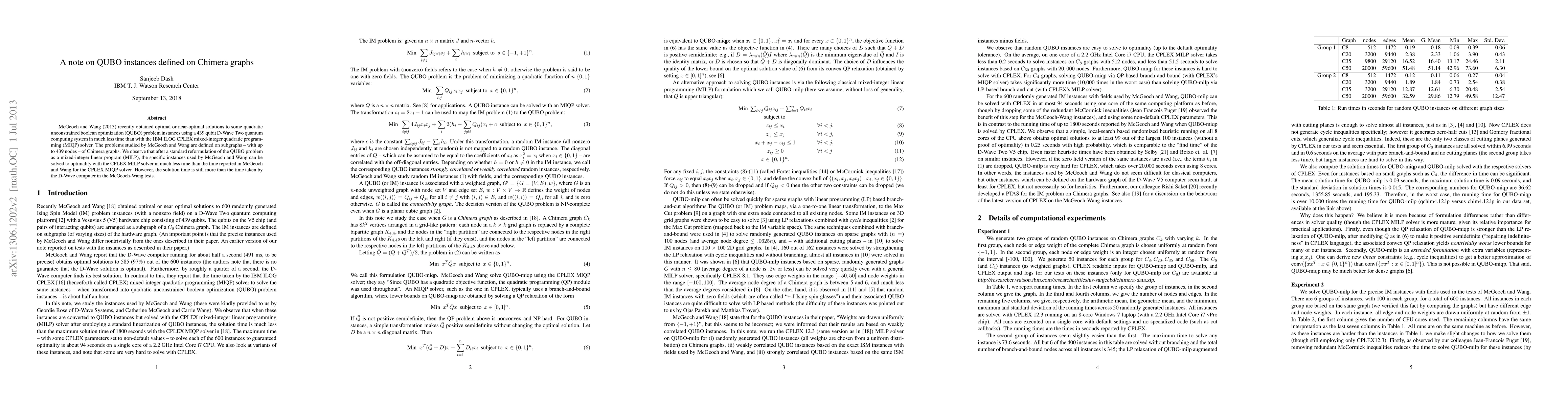 McGeoch and Wang (2013) recently obtained optimal or near-optimal solutions to some quadratic unconstrained boolean optimization (QUBO) problem instances using a 439 qubit D-Wave Two quantum computing system in much less time than with the IBM ILOG CPLEX mixed-integer quadratic programming (MIQP) solver. The problems studied by McGeoch and Wang are defined on subgraphs -- with up to 439 nodes -- of Chimera graphs. We observe that after a standard reformulation of the QUBO problem as a mixed-integer linear program (MILP), the specific instances used by McGeoch and Wang can be solved to optimality with the CPLEX MILP solver in much less time than the time reported in McGeoch and Wang for the CPLEX MIQP solver. However, the solution time is still more than the time taken by the D-Wave computer in the McGeoch-Wang tests.
