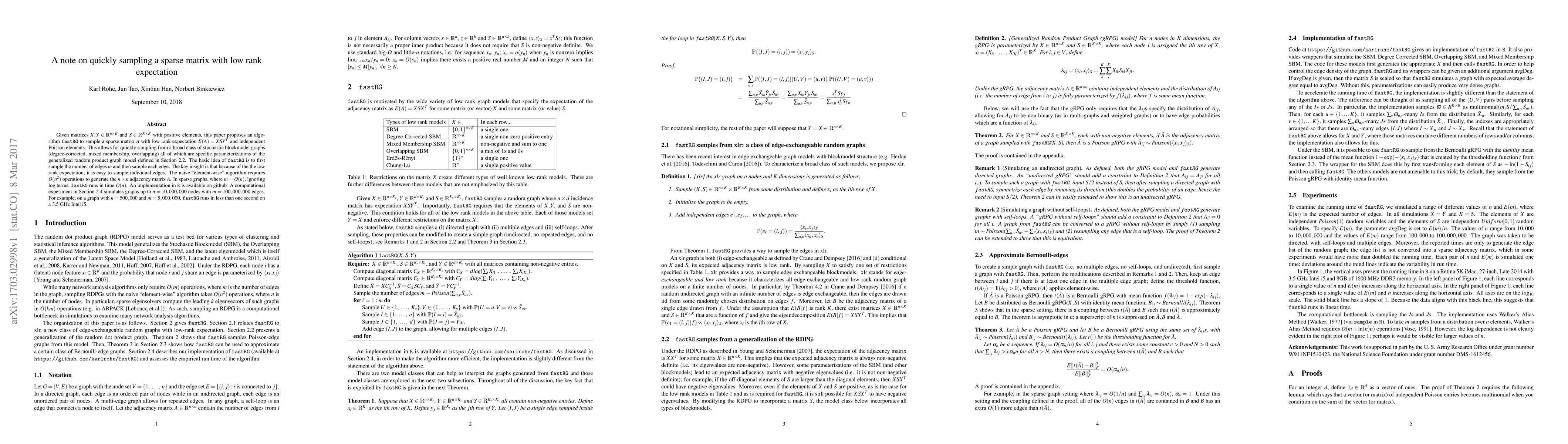Given matrices $X,Y \in R^{n \times K}$ and $S \in R^{K \times K}$ with positive elements, this paper proposes an algorithm fastRG to sample a sparse matrix $A$ with low rank expectation $E(A) = XSY^T$ and independent Poisson elements. This allows for quickly sampling from a broad class of stochastic blockmodel graphs (degree-corrected, mixed membership, overlapping) all of which are specific parameterizations of the generalized random product graph model defined in Section 2.2. The basic idea of fastRG is to first sample the number of edges $m$ and then sample each edge. The key insight is that because of the the low rank expectation, it is easy to sample individual edges. The naive "element-wise" algorithm requires $O(n^2)$ operations to generate the $n\times n$ adjacency matrix $A$. In sparse graphs, where $m = O(n)$, ignoring log terms, fastRG runs in time $O(n)$. An implementation in fastRG is available on github. A computational experiment in Section 2.4 simulates graphs up to $n=10,000,000$ nodes with $m = 100,000,000$ edges. For example, on a graph with $n=500,000$ and $m = 5,000,000$, fastRG runs in less than one second on a 3.5 GHz Intel i5.