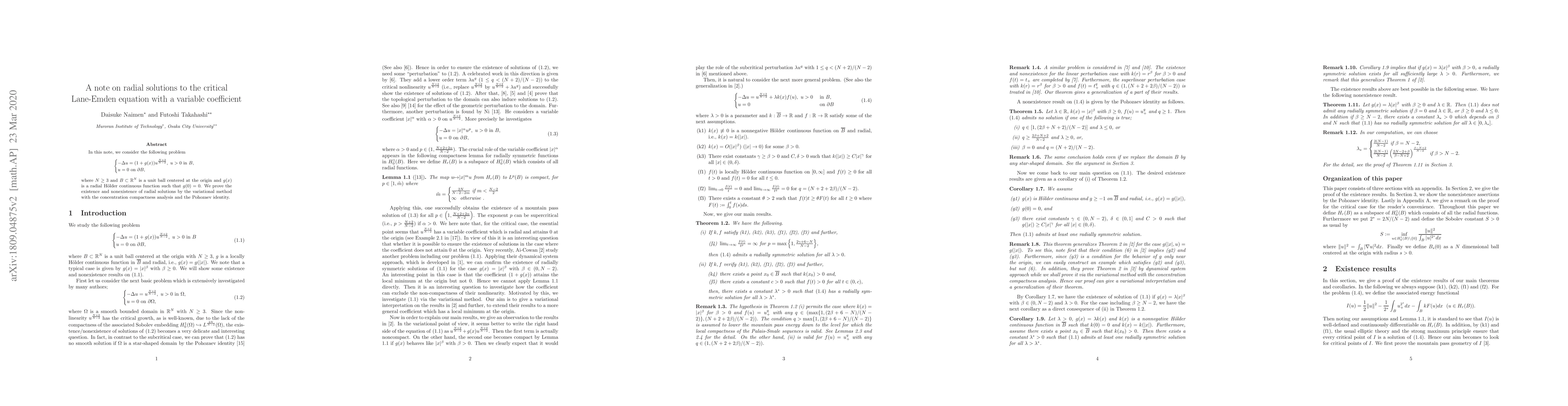 In this note, we consider the following problem, \begin{equation*} \begin{cases} -\Delta u=(1+g(x))u^{\frac{N+2}{N-2}},\ u>0\text{ in }B,\\ u=0\text{ on }\partial B, \end{cases} \end{equation*} where $N\ge3$ and $B\subset \mathbb{R}^N$ is a unit ball centered at the origin and $g(x)$ is a radial H\"{o}lder continuous function such that $g(0)=0$. We prove the existence and nonexistence of radial solutions by the variational method with the concentration compactness analysis and the Pohozaev identity.