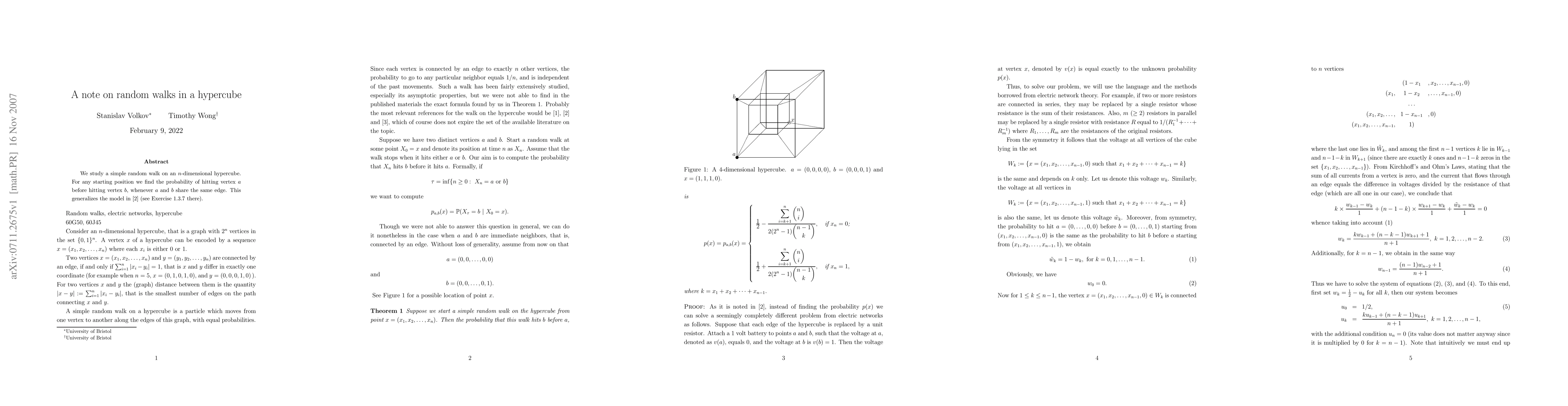 A study on random walks in an n-dimensional hypercube found that for any starting position, there is a probability of hitting one vertex before another if they share the same edge. This generalizes a model from 1984.