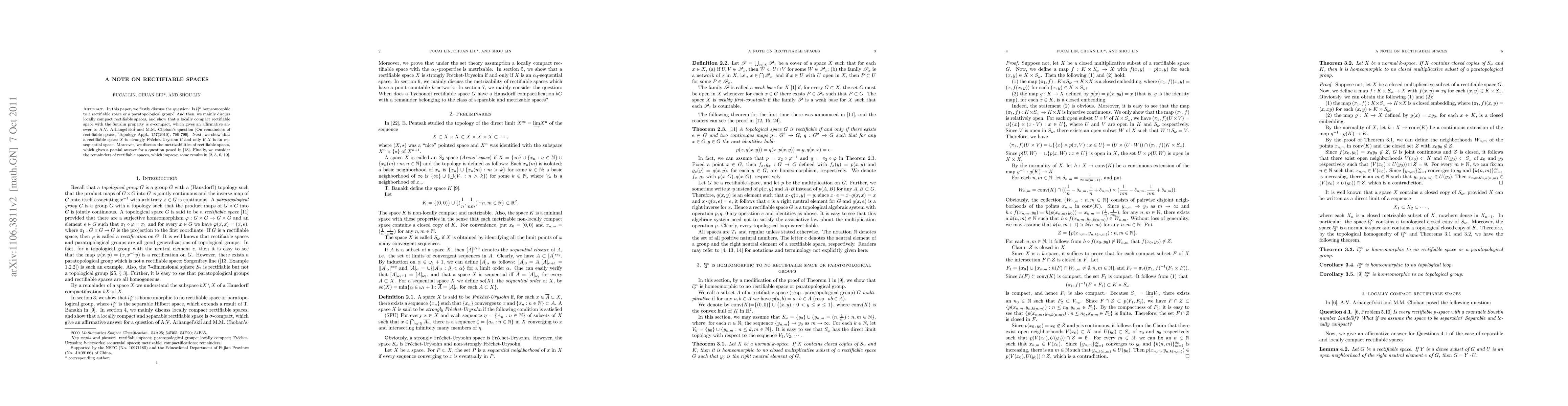 In this paper, we firstly discuss the question: Is $l_{2}^{\infty}$ homeomorphic to a rectifiable space or a paratopological group? And then, we mainly discuss locally compact rectifiable spaces, and show that a locally compact and separable rectifiable space is $\sigma$-compact, which gives an affirmative answer to A.V. Arhangel'ski\v{i} and M.M. Choban's question [On remainders of rectifiable spaces, Topology Appl., 157(2010), 789-799]. Next, we show that a rectifiable space $X$ is strongly Fr$\acute{e}$chet-Urysohn if and only if $X$ is an $\alpha_{4}$-sequential space. Moreover, we discuss the metrizabilities of rectifiable spaces, which gives a partial answer for a question posed in \cite{LFC2009}. Finally, we consider the remainders of rectifiable spaces, which improve some results in \cite{A2005, A2007, A2009, Liu2009}.