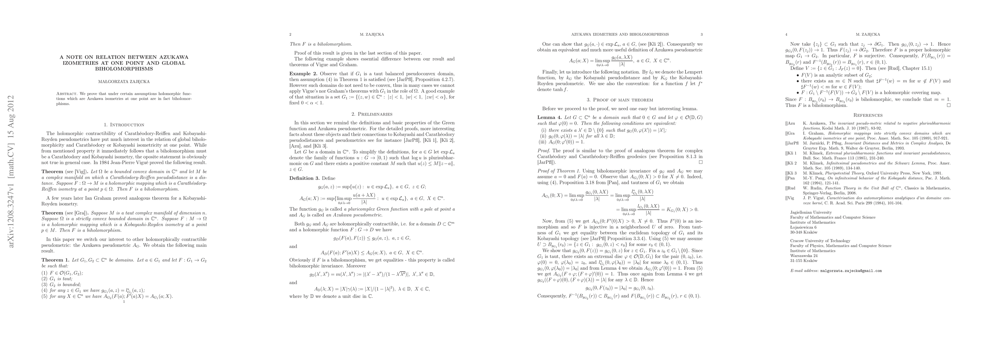 We prove that under certain assumptions holomorphic functions which are Azukawa isometries at one point are in fact biholomorphisms.