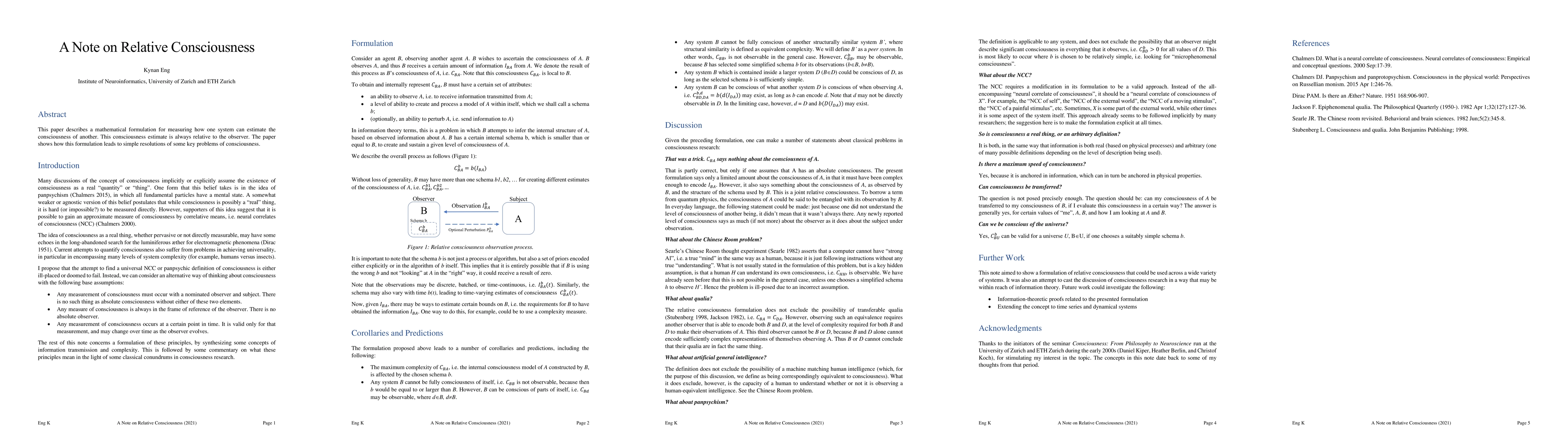 A mathematical formulation is proposed to measure relative consciousness of one system based on an observer, resolving key problems in consciousness.
