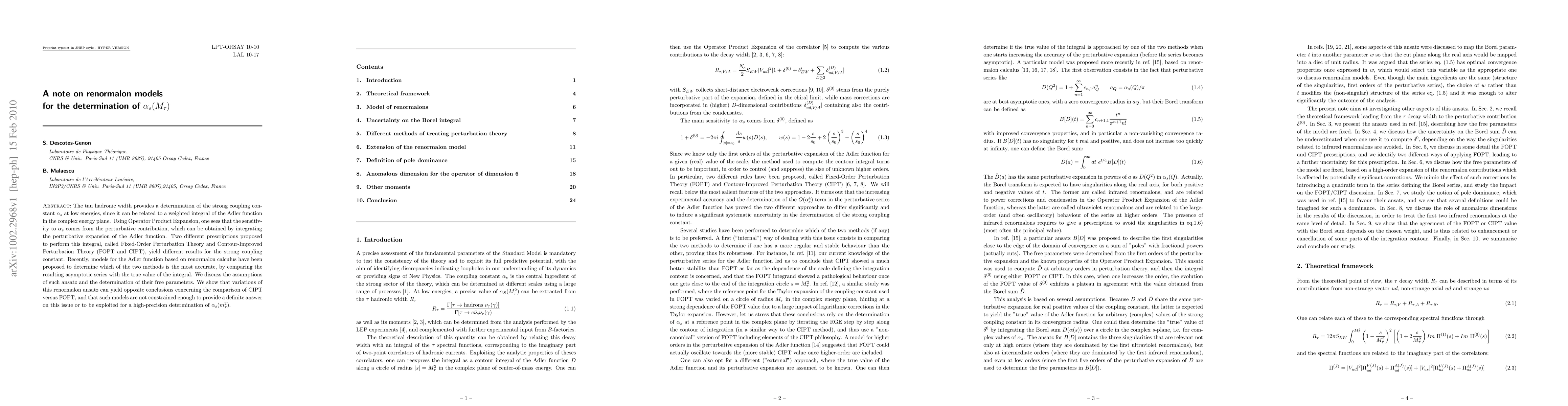 The tau hadronic width provides a determination of the strong coupling constant alpha_s at low energies, since it can be related to a weighted integral of the Adler function in the complex energy plane. Using Operator Product Expansion, one sees that the sensitivity to alpha_s comes from the perturbative contribution, which can be obtained by integrating the perturbative expansion of the Adler function. Two different prescriptions proposed to perform this integral, called Fixed-Order Perturbation Theory and Contour-Improved Perturbation Theory (FOPT and CIPT), yield different results for the strong coupling constant. Recently, models for the Adler function based on renormalon calculus have been proposed to determine which of the two methods is the most accurate, by comparing the resulting asymptotic series with the true value of the integral. We discuss the assumptions of such ansatz and the determination of their free parameters. We show that variations of this renormalon ansatz can yield opposite conclusions concerning the comparison of CIPT versus FOPT, and that such models are not constrained enough to provide a definite answer on this issue or to be exploited for a high-precision determination of alpha_s(m_tau^2).