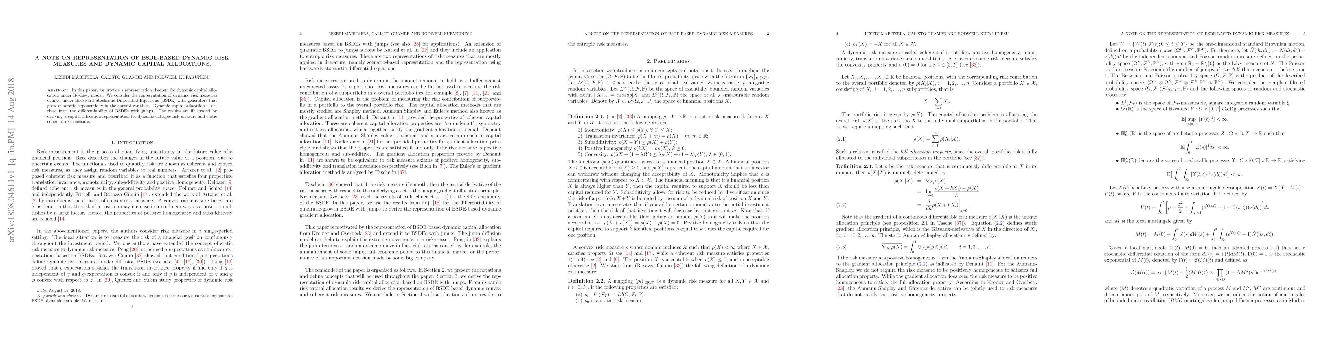 This paper presents a representation theorem for dynamic capital allocation under the Itô-Lévy model, focusing on dynamic risk measures defined via BSDEs with quadratic-exponential growth. It illustrates the results by deriving capital allocation representations for dynamic entropic risk measures and static coherent risk measures.