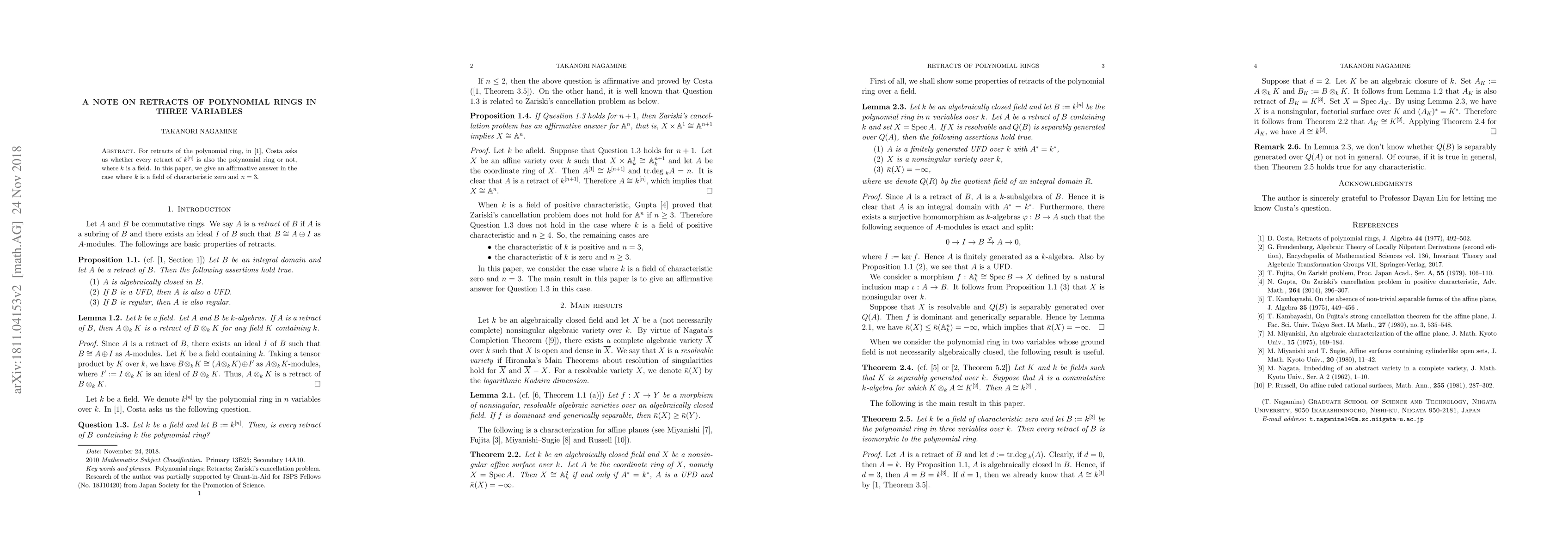 Researchers prove that every retract of a 3-variable polynomial ring in characteristic zero is also the polynomial ring itself.
