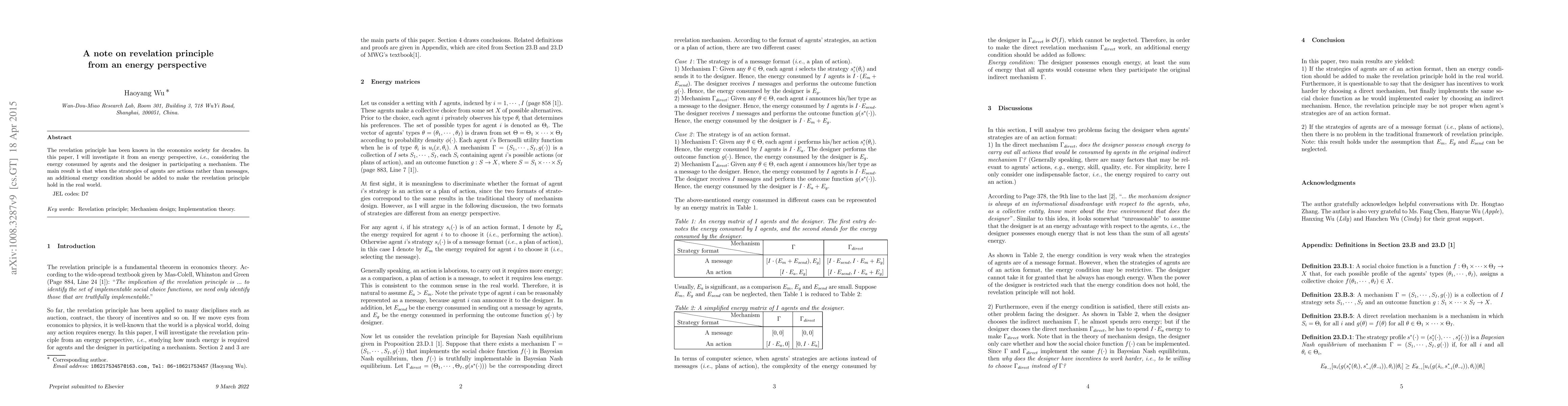 The revelation principle has been known in the economics society for decades. In this paper, I will investigate it from an energy perspective, i.e., considering the energy consumed by agents and the designer in participating a mechanism. The main result is that when the strategies of agents are actions rather than messages, an additional energy condition should be added to make the revelation principle hold in the real world.