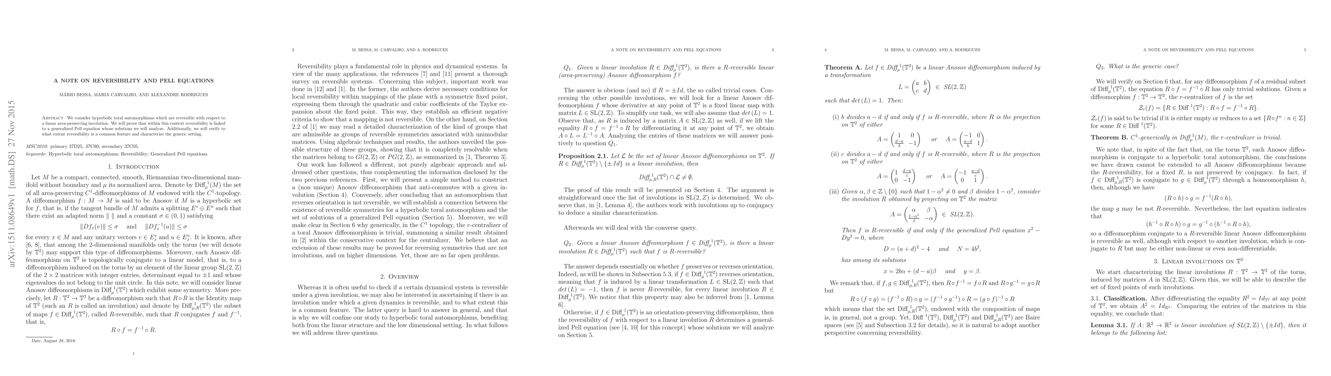 This paper investigates hyperbolic toral automorphisms that are reversible under a linear area-preserving involution, establishing a connection to a generalized Pell equation. The authors analyze the solutions to this equation and characterize the extent and generic setting of reversibility.