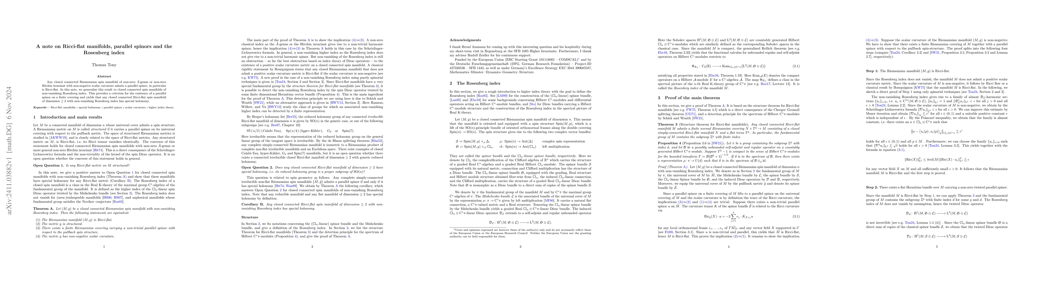 This paper proves that closed connected Ricci-flat spin manifolds with non-zero Rosenberg index possess parallel spinors, leading to the conclusion that they exhibit special holonomy. It generalizes previous results for manifolds with non-zero $\hat{A}$-genus or Hitchin invariant.