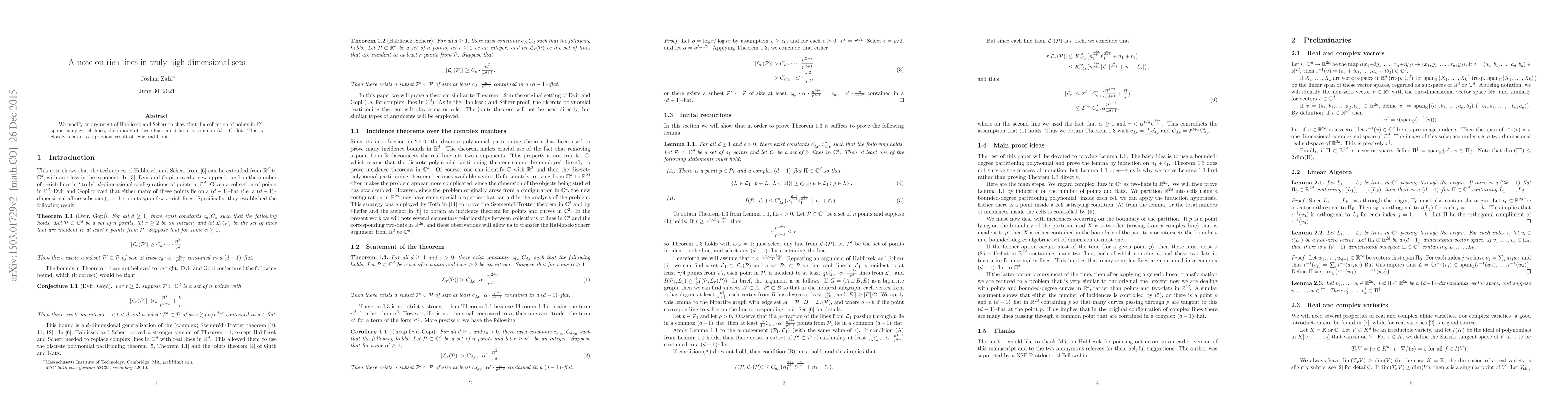 Summary: This paper modifies an argument from Hablicsek and Scherr to demonstrate that if a set of points in $\mathbb{C}^d$ spans numerous $r$-rich lines, many of these lines must reside within a common $(d-1)$-dimensional subspace, linking to a prior result by Dvir and Gopi.