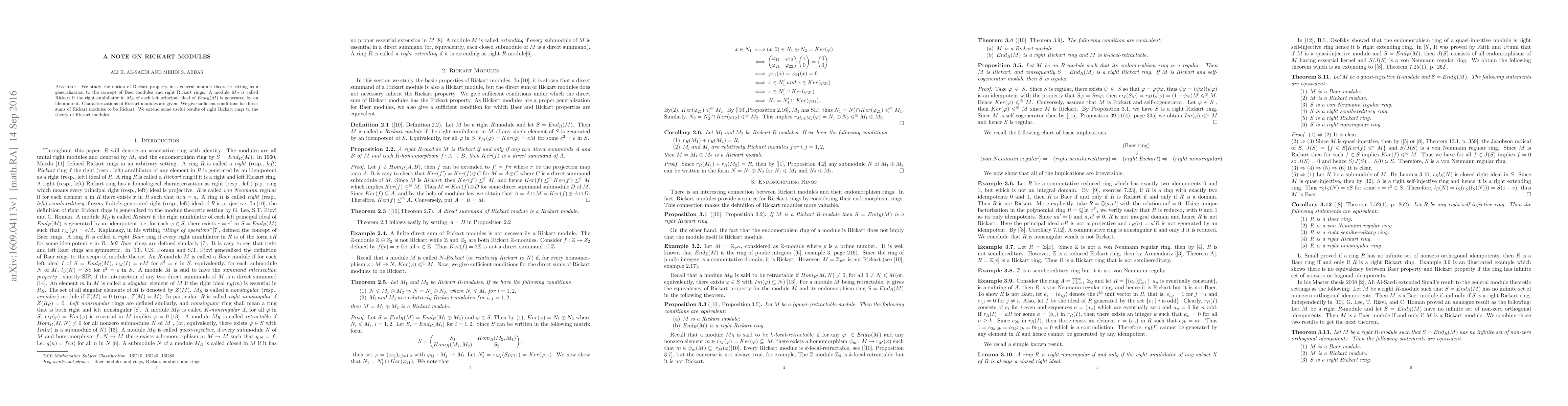 This paper explores the Rickart property in module theory, generalizing Baer modules and right Rickart rings. It characterizes Rickart modules and provides sufficient conditions for direct sums of such modules to retain the Rickart property, extending results from right Rickart rings to this new module-theoretic context.