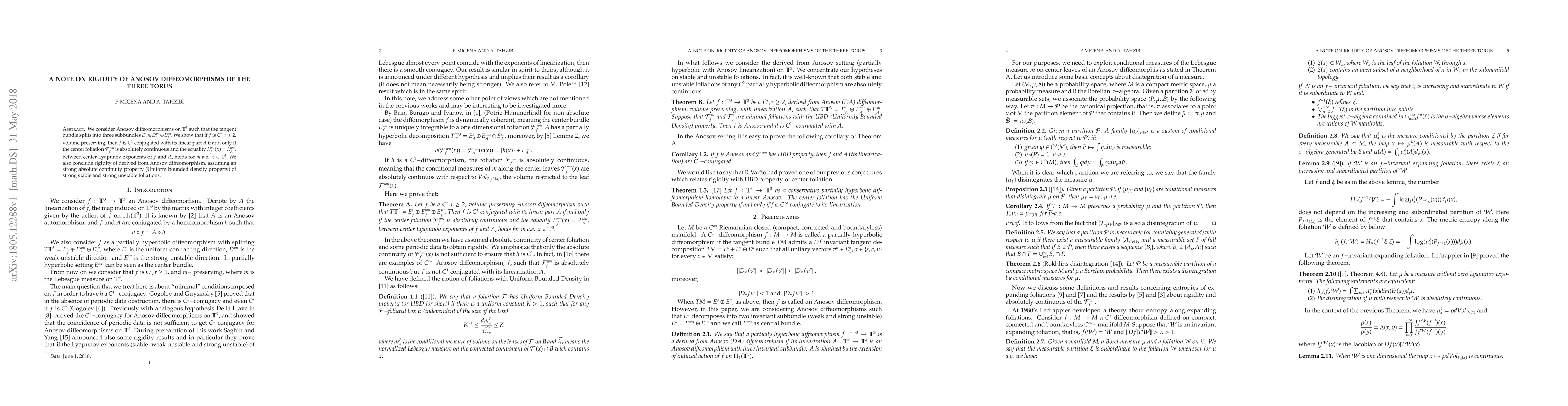 We consider Anosov diffeomorphisms on $\mathbb{T}^3$ such that the tangent bundle splits into three subbundles $E^s_f \oplus E^{wu}_f \oplus E^{su}_f.$ We show that if $f$ is $C^r, r \geq 2,$ volume preserving, then $f$ is $C^1$ conjugated with its linear part $A$ if and only if the center foliation $\mathcal{F}^{wu}_f$ is absolutely continuous and the equality $\lambda^{wu}_f(x) = \lambda^{wu}_A,$ between center Lyapunov exponents of $f$ and $A,$ holds for $m$ a.e. $x \in \mathbb{T}^3.$ We also conclude rigidity of derived from Anosov diffeomorphism, assuming an strong absolute continuity property (Uniform bounded density property) of strong stable and strong unstable foliations.