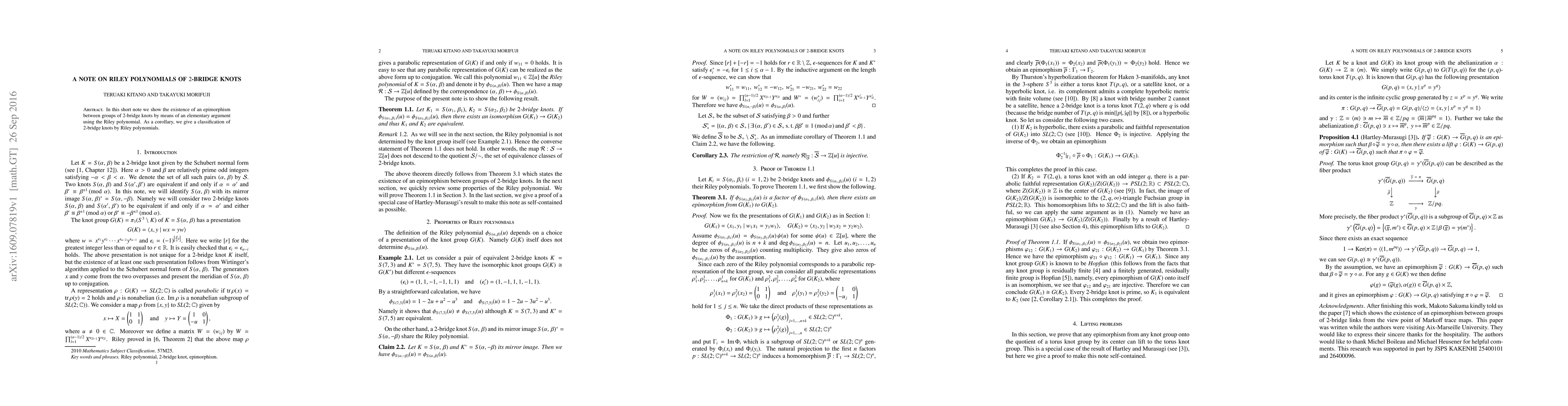 This paper demonstrates an epimorphism between groups of 2-bridge knots using an elementary argument involving Riley polynomials and provides a classification of these knots based on their Riley polynomials.