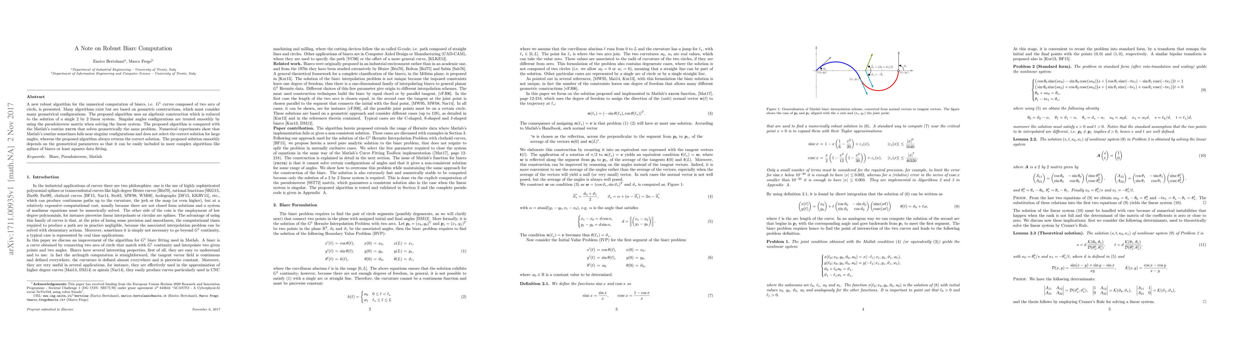 A new robust algorithm for the numerical computation of biarcs, i.e. $G^1$ curves composed of two arcs of circle, is presented. Many algorithms exist but are based on geometric constructions, which must consider many geometrical configurations. The proposed algorithm uses an algebraic construction which is reduced to the solution of a single $2$ by $2$ linear system. Singular angles configurations are treated smoothly by using the pseudoinverse matrix when solving the linear system. The proposed algorithm is compared with the Matlab's routine \texttt{rscvn} that solves geometrically the same problem. Numerical experiments show that Matlab's routine sometimes fails near singular configurations and does not select the correct solution for large angles, whereas the proposed algorithm always returns the correct solution. The proposed solution smoothly depends on the geometrical parameters so that it can be easily included in more complex algorithms like splines of biarcs or least squares data fitting.