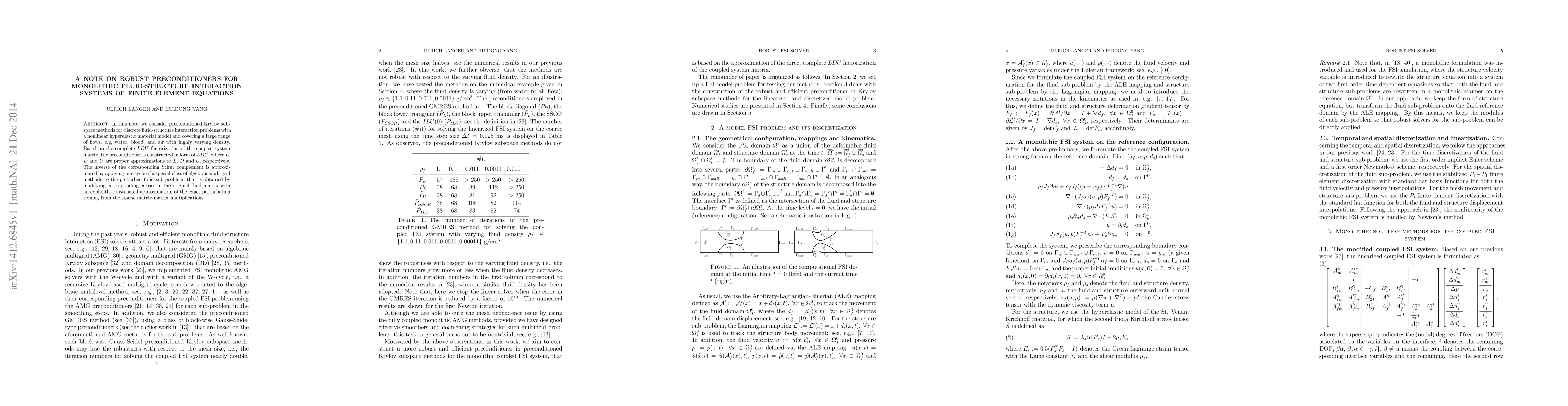 In this note, we consider preconditioned Krylov subspace methods for discrete fluid-structure interaction problems with a nonlinear hyperelastic material model and covering a large range of flows, e.g, water, blood, and air with highly varying density. Based on the complete $LDU$ factorization of the coupled system matrix, the preconditioner is constructed in form of $\hat{L}\hat{D}\hat{U}$, where $\hat{L}$, $\hat{D}$ and $\hat{U}$ are proper approximations to $L$, $D$ and $U$, respectively. The inverse of the corresponding Schur complement is approximated by applying one cycle of a special class of algebraic multigrid methods to the perturbed fluid sub-problem, that is obtained by modifying corresponding entries in the original fluid matrix with an explicitly constructed approximation of the exact perturbation coming from the sparse matrix-matrix multiplications.