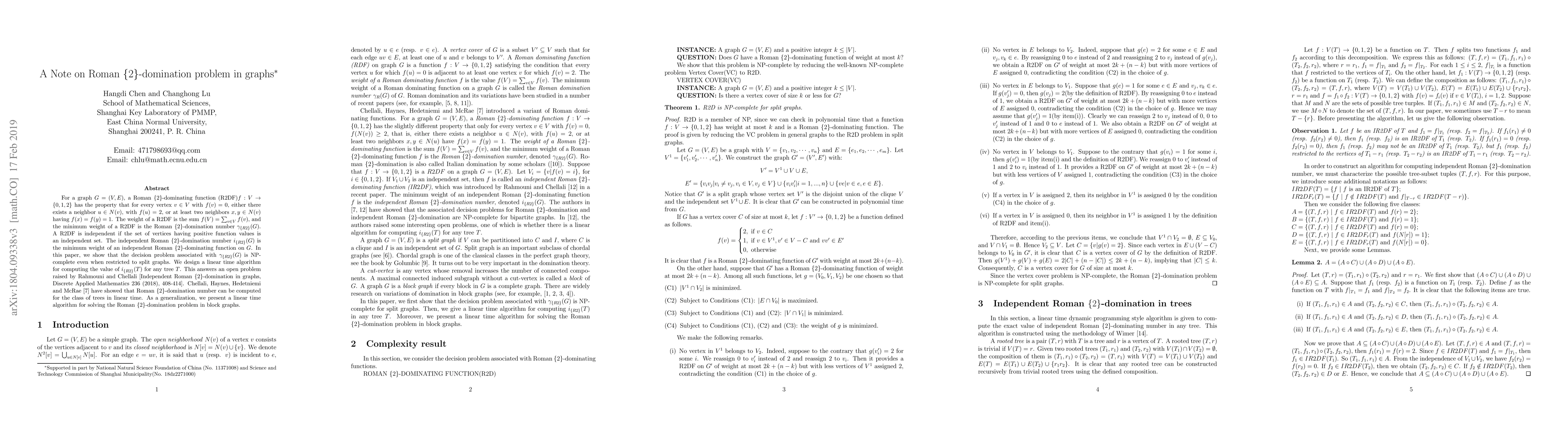 This paper investigates the Roman $\{2\}$-domination problem in graphs, focusing on the minimum weight of a Roman $\{2\}$-dominating function and the independent variant. It demonstrates that the decision problem for the Roman $\{2\}$-domination number is NP-complete for split graphs and provides linear time algorithms for computing the independent Roman $\{2\}$-domination number in trees and block graphs.