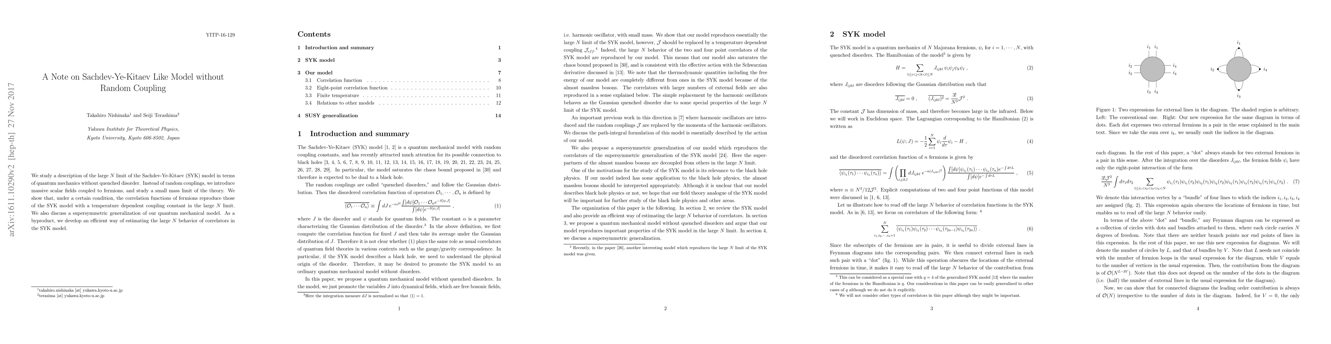 This paper explores a quantum mechanical model without quenched disorder to describe the large N limit of the Sachdev-Ye-Kitaev (SYK) model, replacing random couplings with massive scalar fields. It shows that under specific conditions, the model's fermion correlation functions match those of the SYK model, and it develops a method for estimating large N behavior in the SYK model.