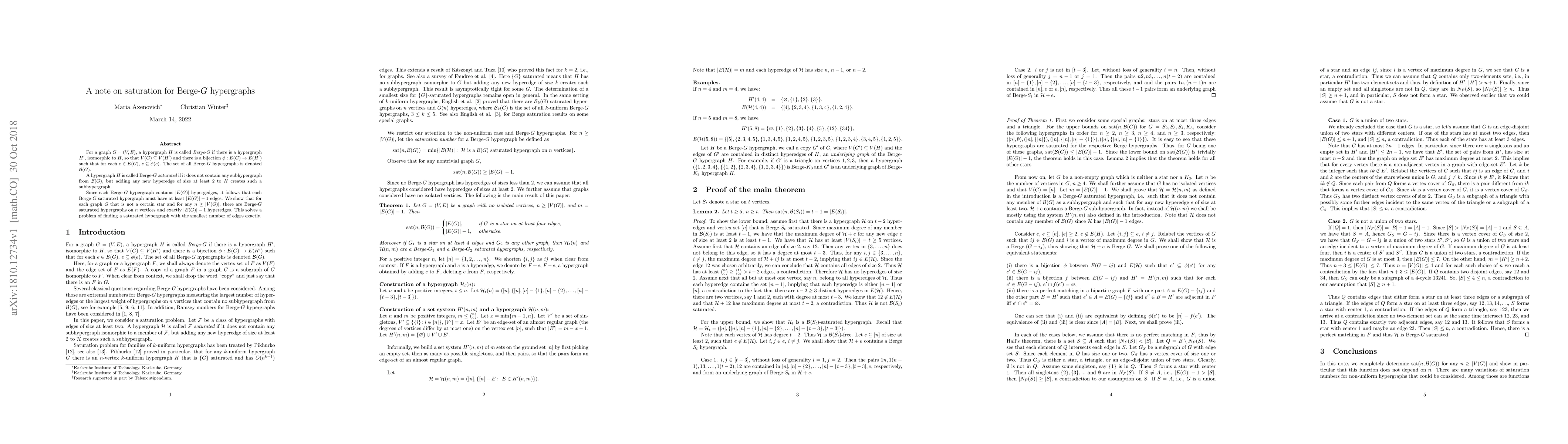 This paper proves the existence of a Berge-G saturated hypergraph on n vertices with exactly |E(G)|-1 hyperedges for any graph G that is not a certain star, addressing a longstanding problem regarding hypergraph saturation. Each such hypergraph avoids smaller Berge-G hypergraphs but includes the minimum number of hyperedges required.