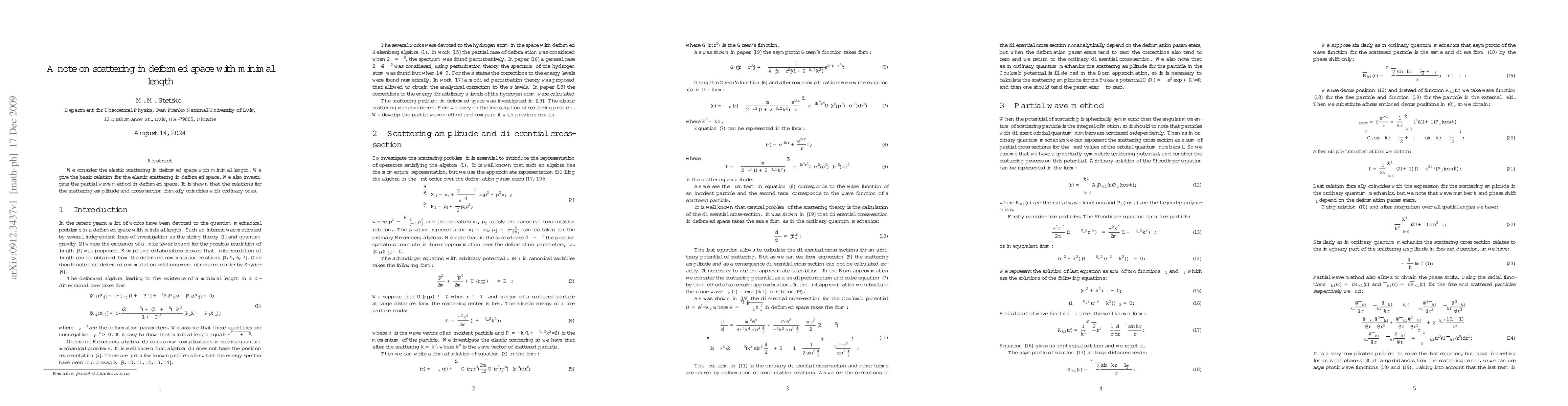 This paper explores elastic scattering in a deformed space with minimal length, deriving the fundamental scattering relations and applying the partial wave method. It concludes that scattering amplitude and cross-section relations in this context align with traditional formulations.