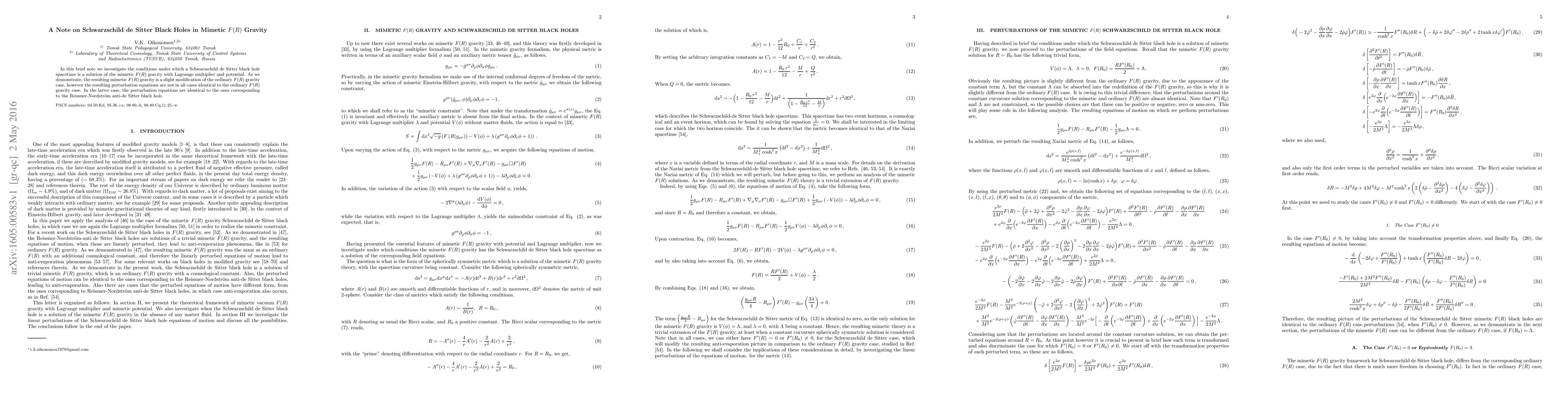 In this brief note we investigate the conditions under which a Schwarzschild de Sitter black hole spacetime is a solution of the mimetic $F(R)$ gravity with Lagrange multiplier and potential. As we demonstrate, the resulting mimetic $F(R)$ gravity is a slight modification of the ordinary $F(R)$ gravity case, however the resulting perturbation equations are not in all cases identical to the ordinary $F(R)$ gravity case. In the latter case, the perturbation equations are identical to the ones corresponding to the Reissner-Nordstr\"{o}m anti-de Sitter black hole.
