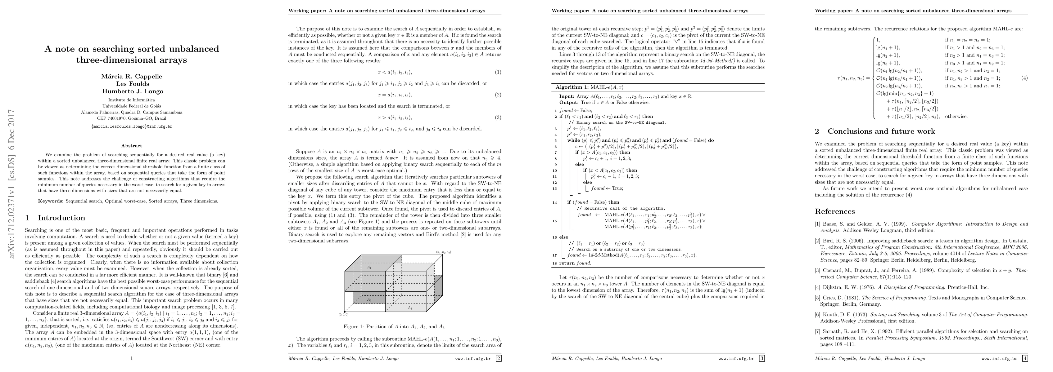 This paper investigates efficient algorithms for searching a sorted, unbalanced three-dimensional array to find a specific value, focusing on minimizing the number of queries required in the worst-case scenario, despite the array dimensions not being equal. The challenge lies in determining the optimal dimensional threshold function through sequential point samples.