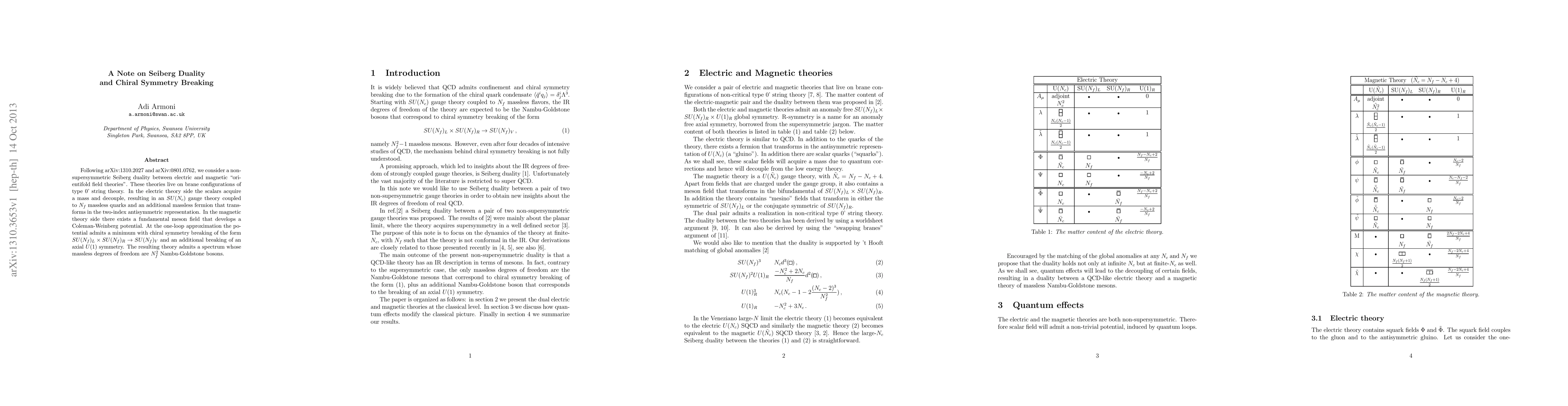 This paper explores non-supersymmetric Seiberg duality in type 0' string theory, showing how electric and magnetic field theories relate through decoupling and chiral symmetry breaking. The magnetic theory exhibits a meson field with a Coleman-Weinberg potential leading to SU(Nf)L x SU(Nf)R --> SU(Nf)V symmetry breaking and Nf^2 massless Nambu-Goldstone bosons.