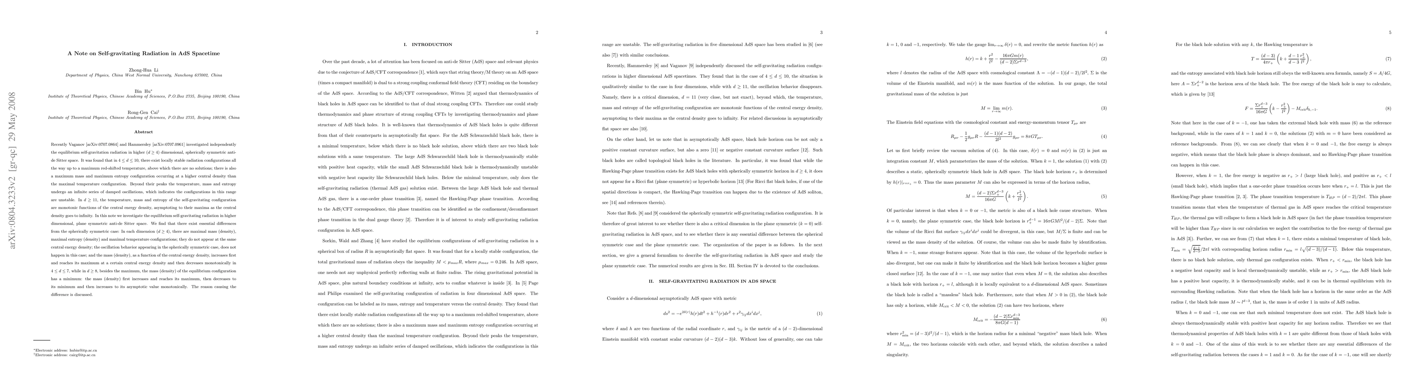 In this paper we investigate the equilibrium self-gravitating radiation in higher dimensional, plane symmetric anti-de Sitter space. We find that there exist essential differences from the spherically symmetric case: In each dimension ($d\geq 4$), there are maximal mass (density), maximal entropy (density) and maximal temperature configurations, they do not appear at the same central energy density; the oscillation behavior appearing in the spherically symmetric case, does not happen in this case; and the mass (density), as a function of the central energy density, increases first and reaches its maximum at a certain central energy density and then decreases monotonically in $ 4\le d \le 7$, while in $d \geq 8$, besides the maximum, the mass (density) of the equilibrium configuration has a minimum: the mass (density) first increases and reaches its maximum, then decreases to its minimum and then increases to its asymptotic value monotonically. The reason causing the difference is discussed.