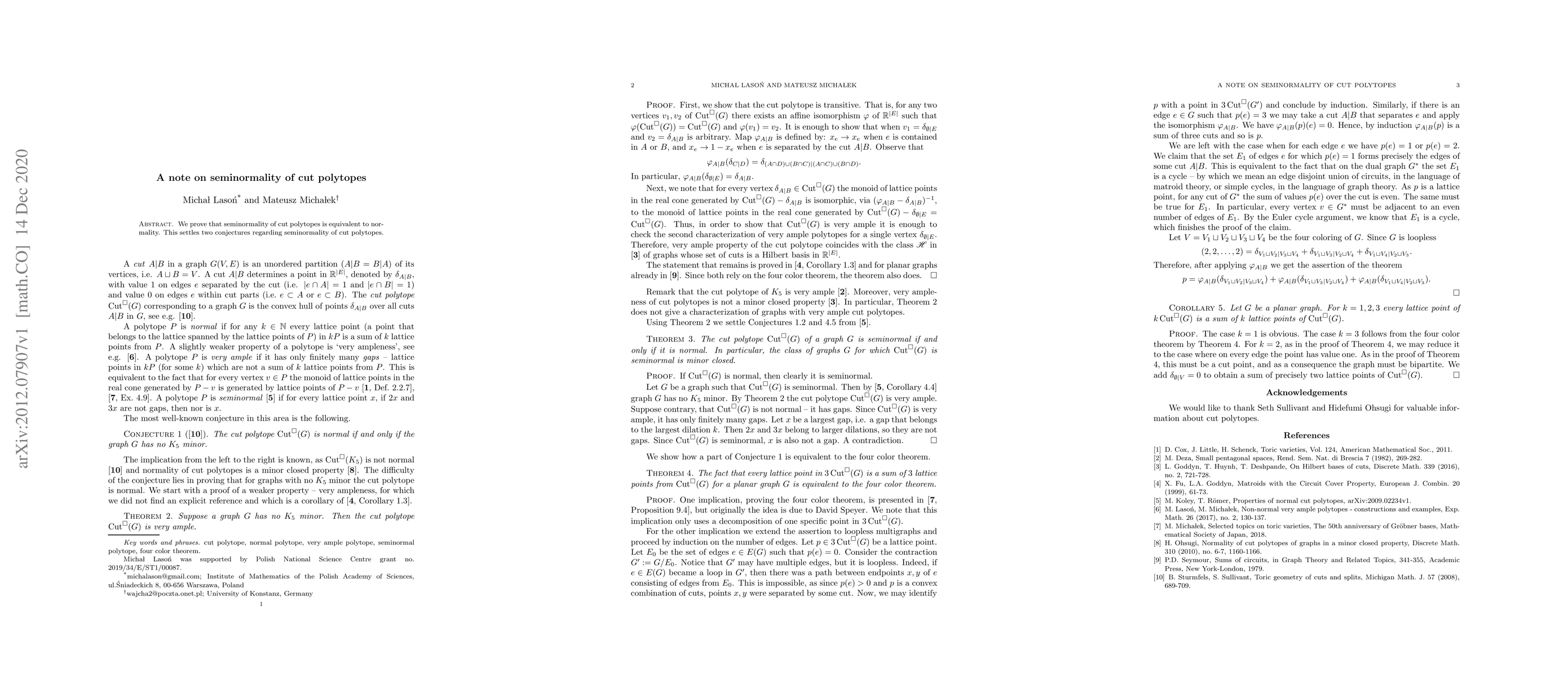This research establishes that the seminormality of cut polytopes is equivalent to their normality, thereby resolving two longstanding conjectures in the field. The findings provide a clearer understanding of the properties of cut polytopes.