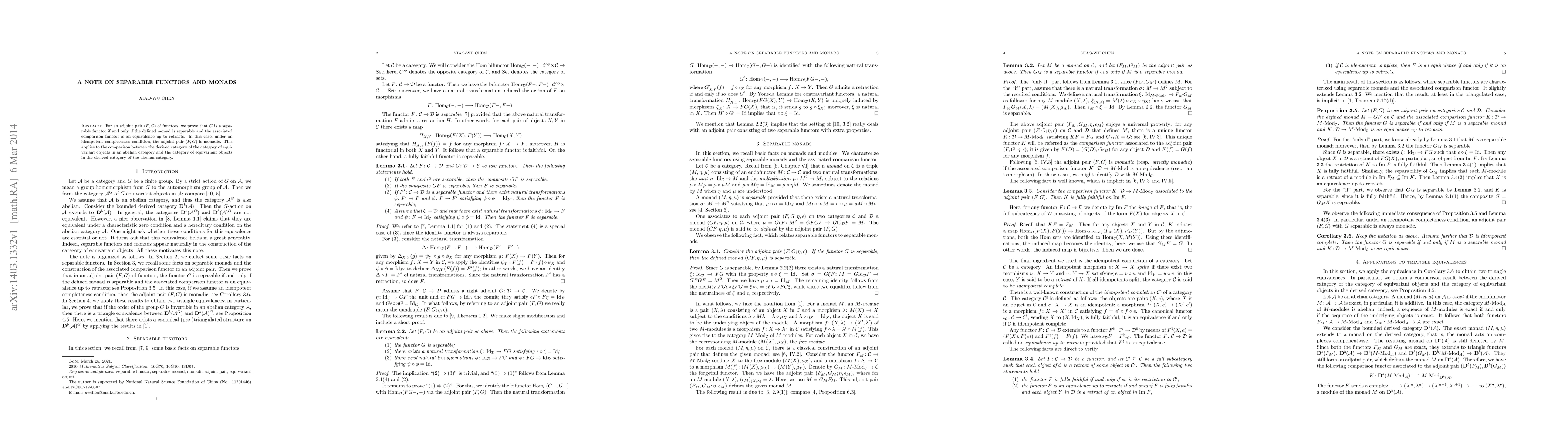 The paper proves a characterization of separable functors in terms of separable monads and their associated comparison functors, extending previous work on separable monads.