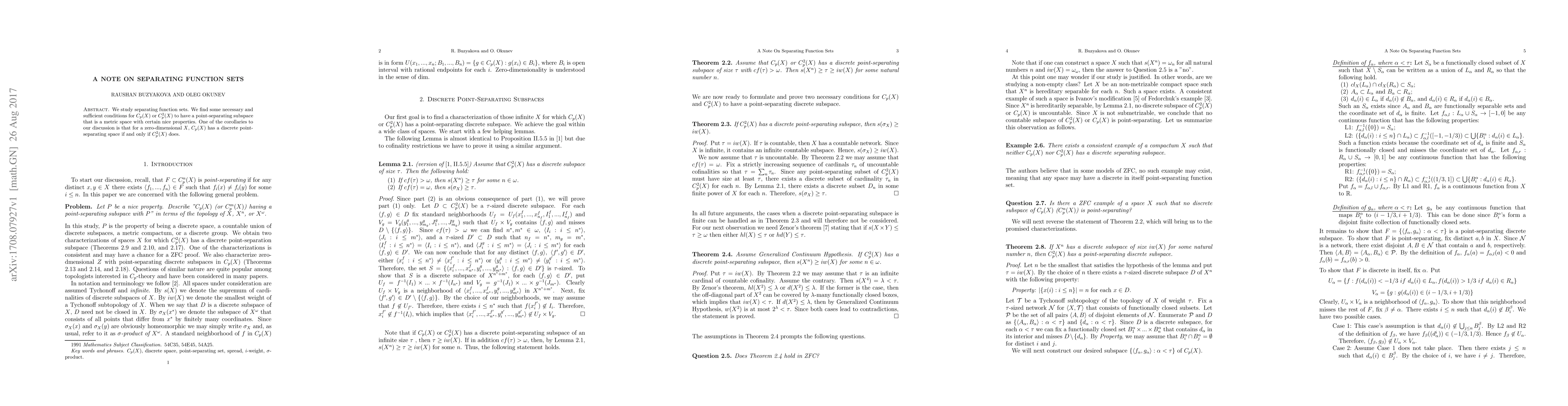 This paper studies separating function sets in metric spaces, finding necessary and sufficient conditions for certain properties, particularly in zero-dimensional spaces where point-separating subspaces can be discrete.