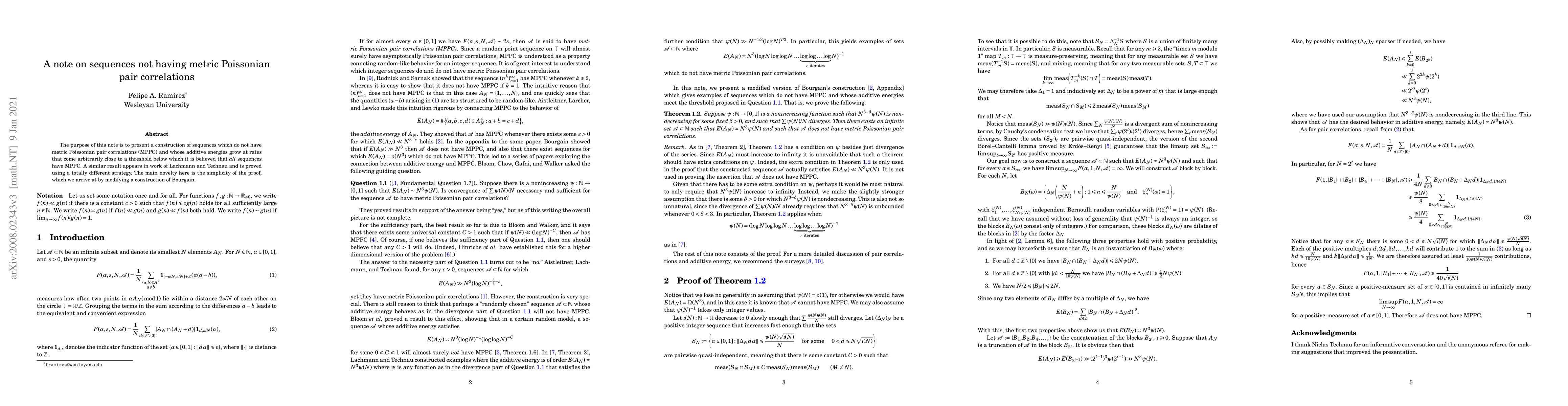The purpose of this note is to present a construction of sequences which do not have metric Poissonian pair correlations (MPPC) and whose additive energies grow at rates that come arbitrarily close to a threshold below which it is believed that all sequences have MPPC. A similar result appears in work of Lachmann and Technau and is proved using a totally different strategy. The main novelty here is the simplicity of the proof, which we arrive at by modifying a construction of Bourgain.
