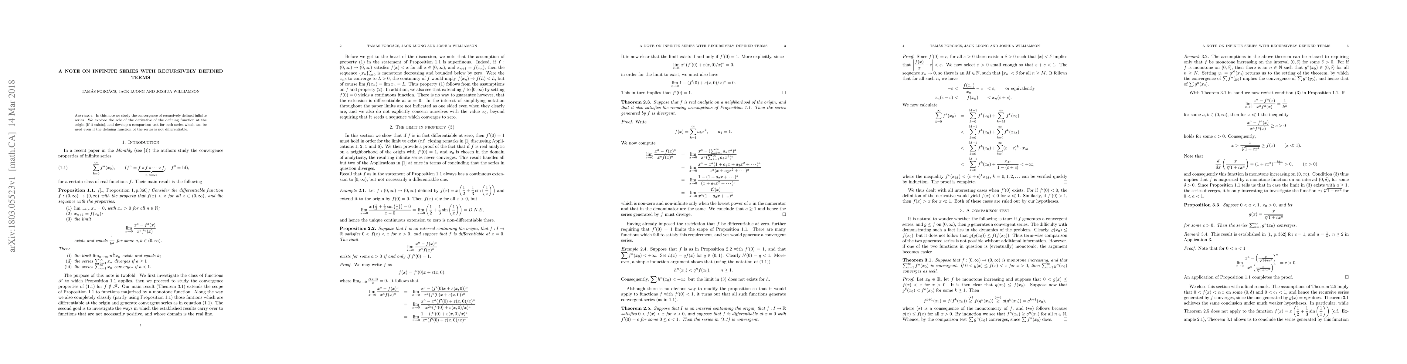 This paper investigates the convergence of recursively defined infinite series, focusing on the influence of the derivative of the defining function at the origin. It introduces a comparison test applicable even when the defining function lacks differentiability.