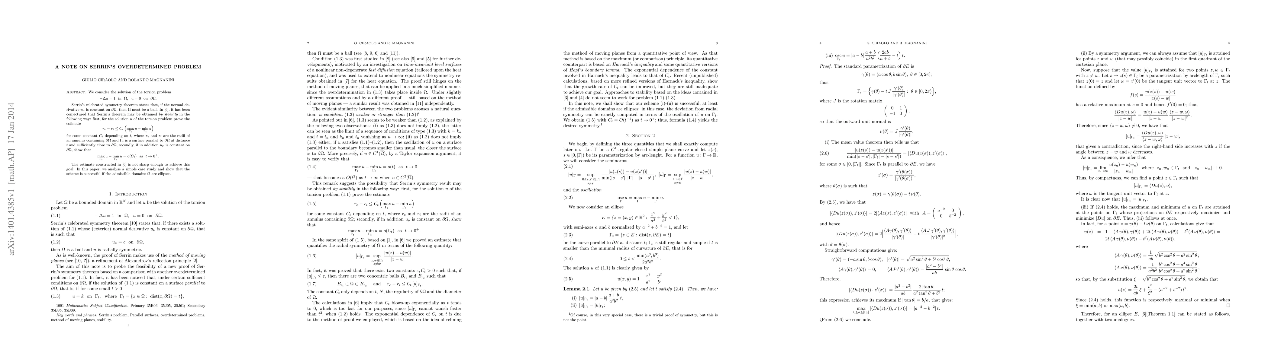 We consider the solution of the torsion problem $-\Delta u=1$ in $\Omega$ and $u=0$ on $\partial \Omega$. Serrin's celebrated symmetry theorem states that, if the normal derivative $u_\nu$ is constant on $\partial \Omega$, then $\Omega$ must be a ball. In a recent paper, it has been conjectured that Serrin's theorem may be obtained {\it by stability} in the following way: first, for the solution $u$ of the torsion problem prove the estimate $$ r_e-r_i\leq C_t\,\Bigl(\max_{\Gamma_t} u-\min_{\Gamma_t} u\Bigr) $$ for some constant $C_t$ depending on $t$, where $r_e$ and $r_i$ are the radii of an annulus containing $\partial\Omega$ and $\Gamma_t$ is a surface parallel to $\partial\Omega$ at distance $t$ and sufficiently close to $\partial\Omega$; secondly, if in addition $u_\nu$ is constant on $\partial\Omega$, show that $$ \max_{\Gamma_t} u-\min_{\Gamma_t} u=o(C_t)\ \mbox{as} \ t\to 0^+. $$ In this paper, we analyse a simple case study and show that the scheme is successful if the admissible domains $\Omega$ are ellipses.