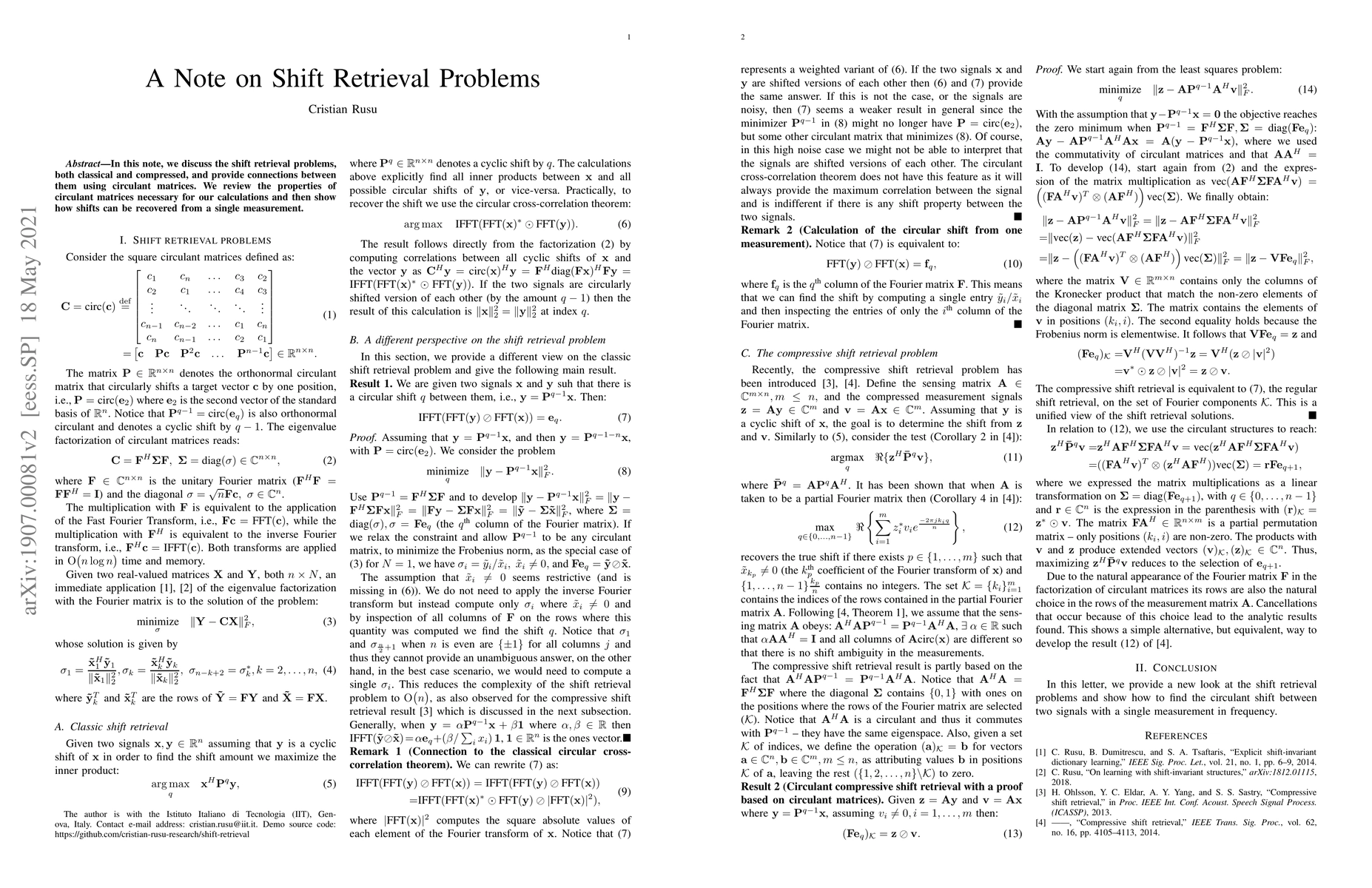 The paper discusses shift retrieval problems, both classical and compressed, using circulant matrices. It reviews necessary properties of circulant matrices and demonstrates how shifts can be recovered from a single measurement.