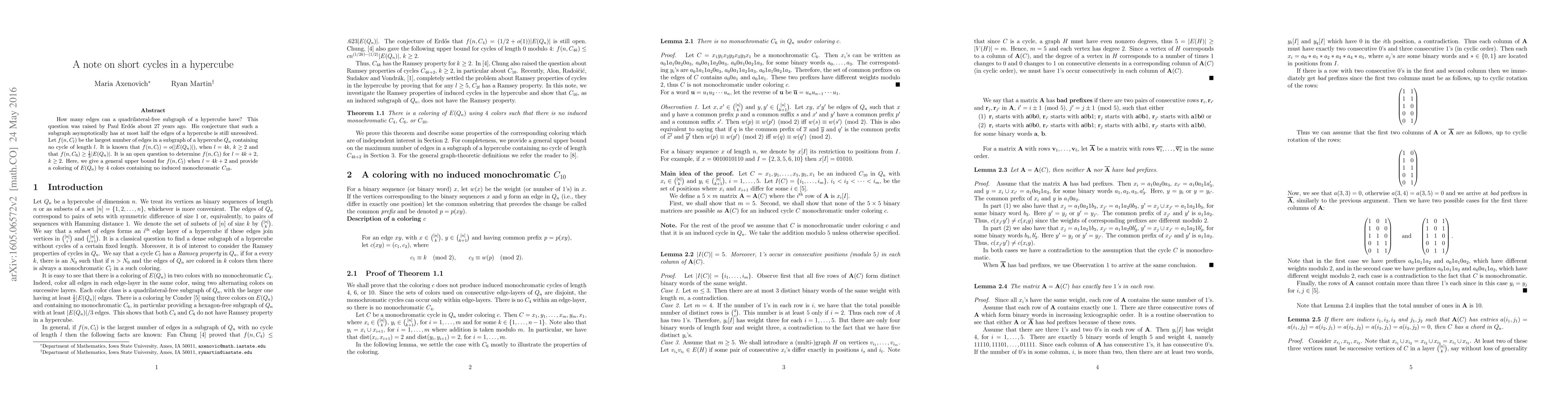 How many edges can a quadrilateral-free subgraph of a hypercube have? This question was raised by Paul Erd\H{o}s about $27$ years ago. His conjecture that such a subgraph asymptotically has at most half the edges of a hypercube is still unresolved. Let $f(n,C_l)$ be the largest number of edges in a subgraph of a hypercube $Q_n$ containing no cycle of length $l$. It is known that $f(n, C_l) = o(|E(Q_n)|)$, when $l= 4k$, $k\geq 2$ and that $f(n, C_6) \geq \frac{1}{3} |E(Q_n)|$. It is an open question to determine $f(n, C_l)$ for $l=4k+2$, $k\geq 2$. Here, we give a general upper bound for $f(n,C_l)$ when $l=4k+2$ and provide a coloring of $E(Q_n)$ by $4$ colors containing no induced monochromatic $C_{10}$.