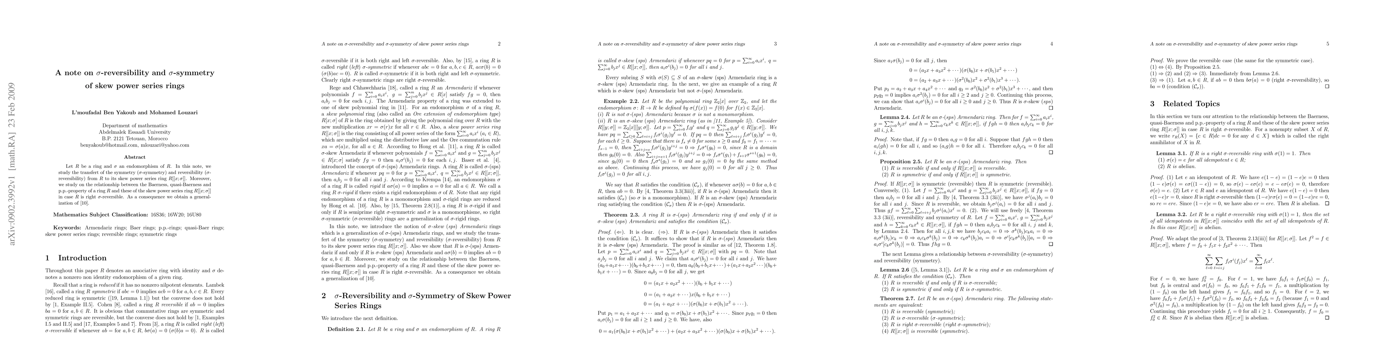 Let $R$ be a ring and $\sigma$ an endomorphism of $R$. In this note, we study the transfert of the symmetry ($\sigma$-symmetry) and reversibility ($\sigma$-reversibility) from $R$ to its skew power series ring $R[[x;\sigma]]$. Moreover, we study on the relationship between the Baerness, quasi-Baerness and p.p.-property of a ring $R$ and these of the skew power series ring $R[[x;\sigma]]$ in case $R$ is right $\sigma$-reversible. As a consequence we obtain a generalization of \cite{hong/2000}.