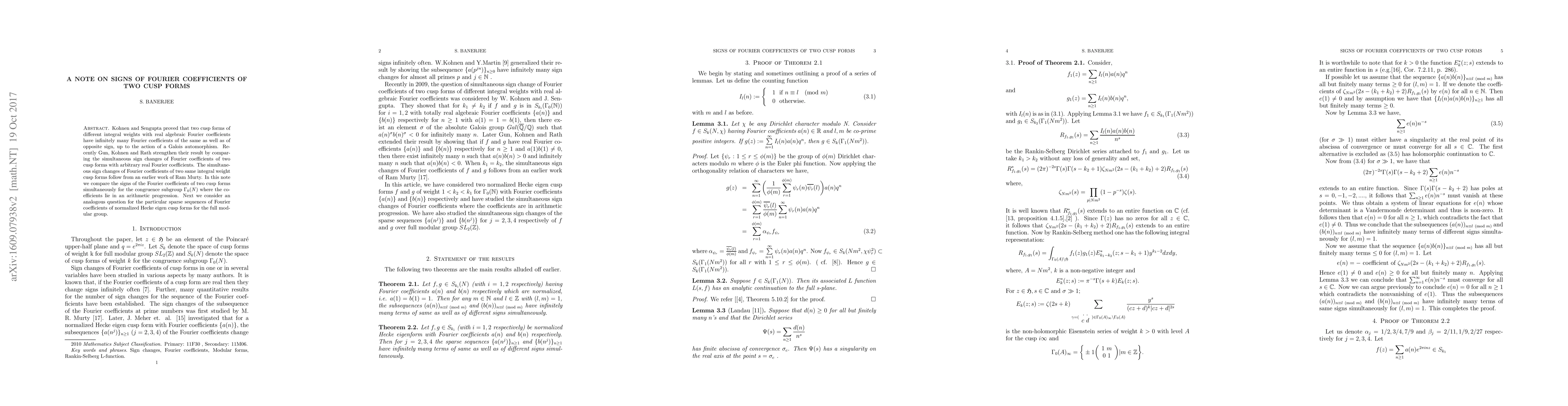 This note investigates the signs of Fourier coefficients for two cusp forms under specific conditions, building on prior work by Kohnen, Sengupta, Gun, and Ram Murty. It examines both the congruence subgroup $\Gamma_0(N)$ and the full modular group, focusing on the arithmetic progression of coefficients and sparse sequences of normalized Hecke eigen cusp forms.