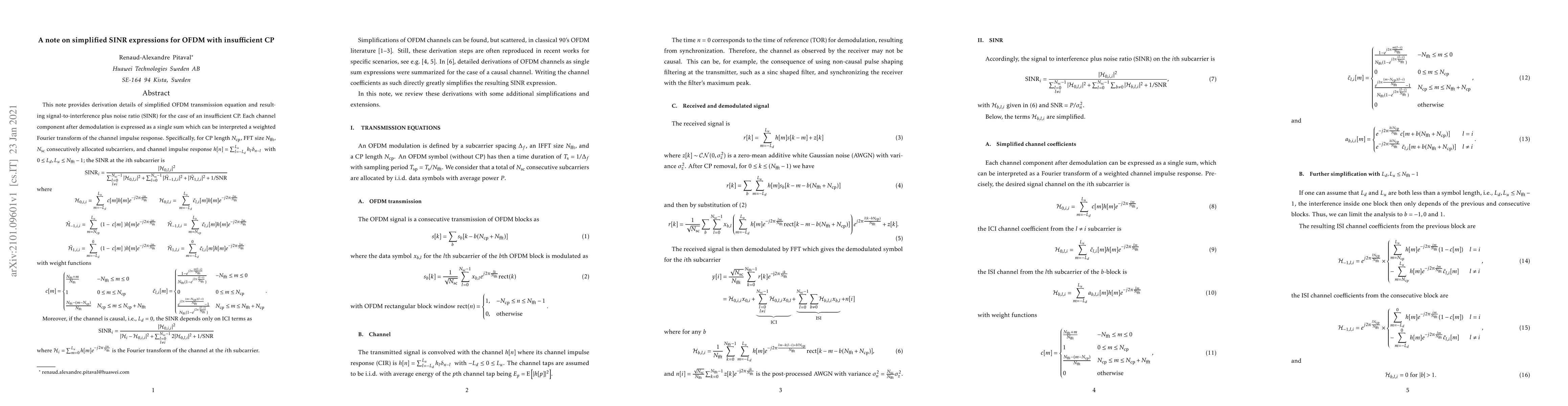 This note provides derivation details of simplified OFDM transmission equation and resulting signal-to-interference plus noise ratio (SINR) for the case of an insufficient CP. Each channel component after demodulation is expressed as a single sum which can be interpreted a weighted Fourier transform of the channel impulse response.