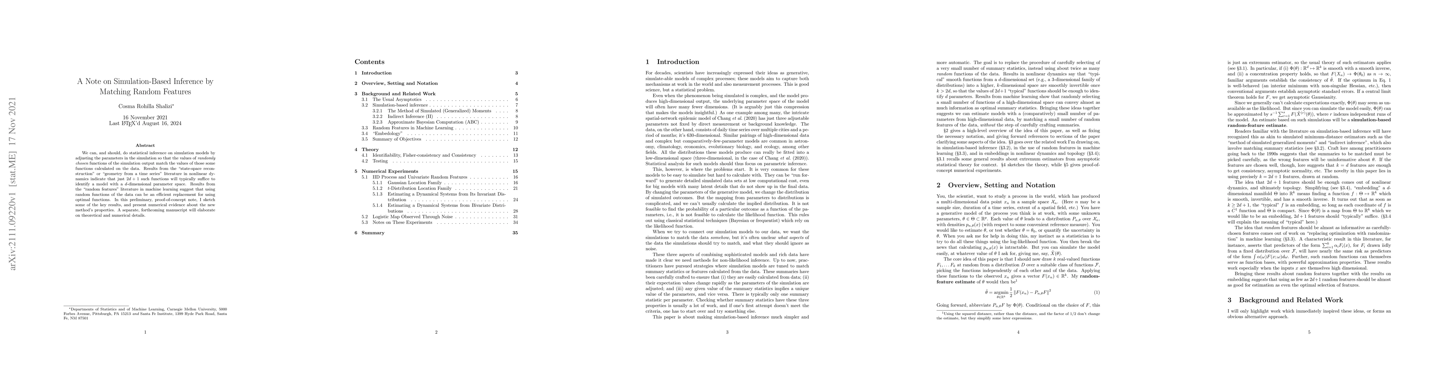 We can, and should, do statistical inference on simulation models by adjusting the parameters in the simulation so that the values of {\em randomly chosen} functions of the simulation output match the values of those same functions calculated on the data. Results from the "state-space reconstruction" or "geometry from a time series'' literature in nonlinear dynamics indicate that just $2d+1$ such functions will typically suffice to identify a model with a $d$-dimensional parameter space. Results from the "random features" literature in machine learning suggest that using random functions of the data can be an efficient replacement for using optimal functions. In this preliminary, proof-of-concept note, I sketch some of the key results, and present numerical evidence about the new method's properties. A separate, forthcoming manuscript will elaborate on theoretical and numerical details.