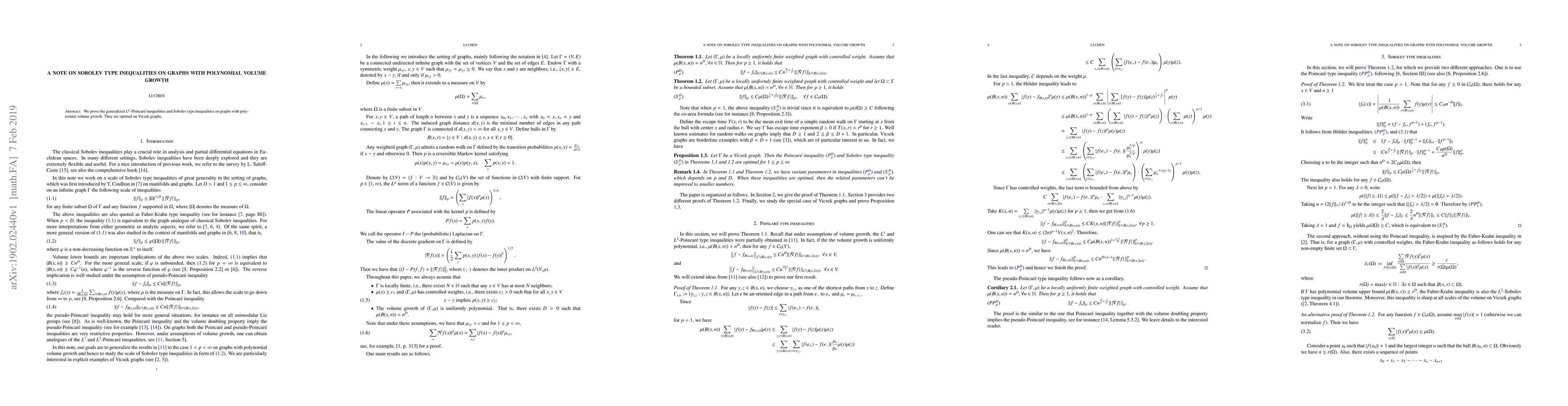 We prove a scale of generalized $L^p$-Poincar\'e inequalities and Sobolev type inequalities on graphs with polynomial volume growth. They are optimal on Vicsek graphs.