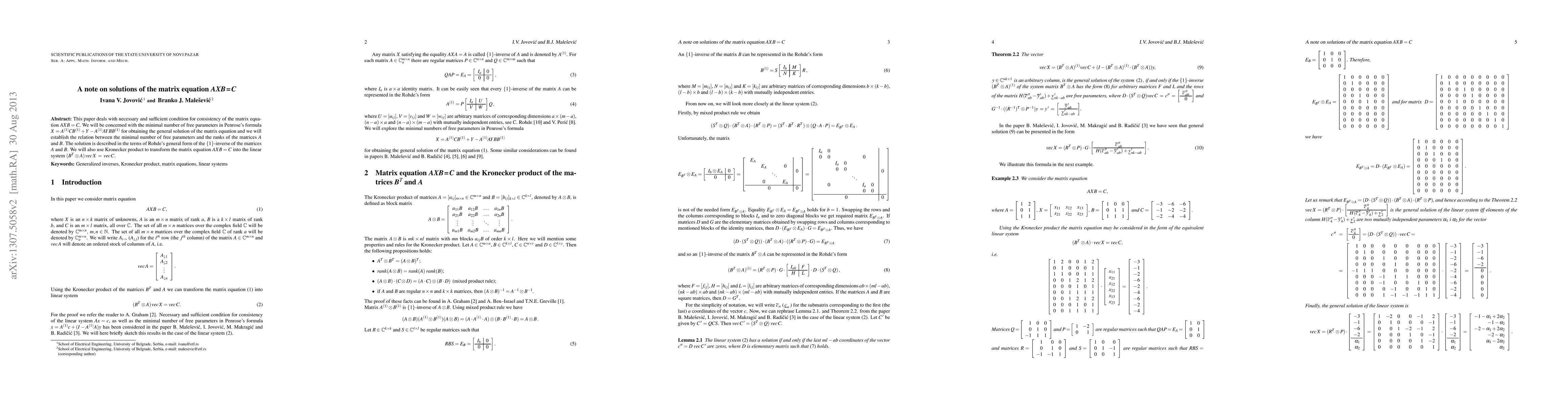 This paper establishes necessary and sufficient conditions for the consistency of the matrix equation $AXB = C$ and determines the minimal number of free parameters in the general solution. It relates this minimal number to the ranks of matrices A and B, using Rohde's general form of inverses and the Kronecker product to transform the equation into a linear system.