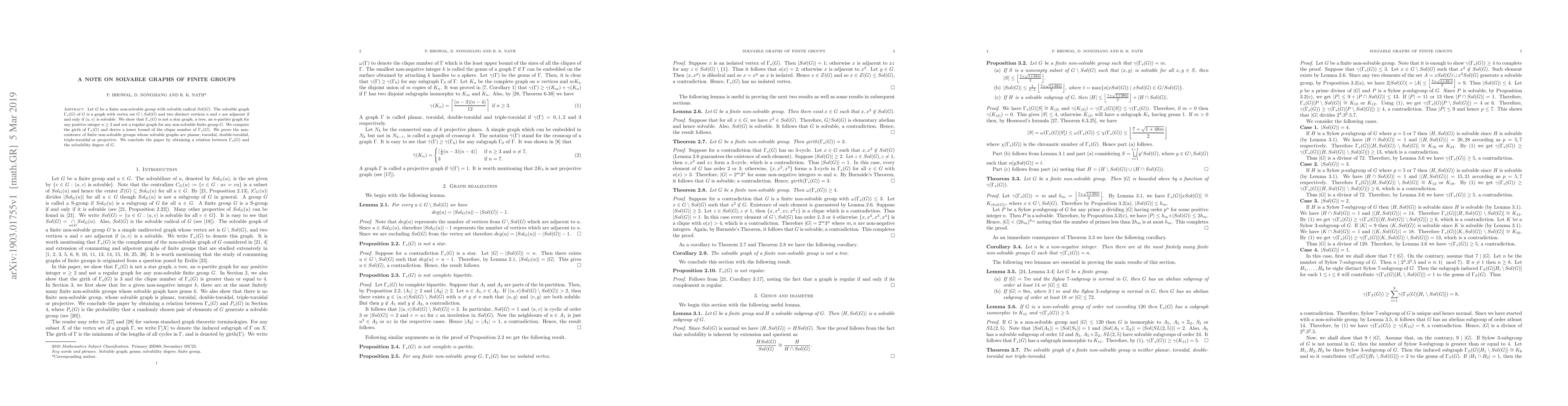 Let $G$ be a finite non-solvable group with solvable radical $Sol(G)$. The solvable graph $\Gamma_s(G)$ of $G$ is a graph with vertex set $G\setminus Sol(G)$ and two distinct vertices $u$ and $v$ are adjacent if and only if $\langle u, v \rangle$ is solvable. We show that $\Gamma_s (G)$ is not a star graph, a tree, an $n$-partite graph for any positive integer $n \geq 2$ and not a regular graph for any non-solvable finite group $G$. We compute the girth of $\Gamma_s (G)$ and derive a lower bound of the clique number of $\Gamma_s (G)$. We prove the non-existence of finite non-solvable groups whose solvable graphs are planar, toroidal, double-toroidal, triple-toroidal or projective. We conclude the paper by obtaining a relation between $\Gamma_s (G)$ and the solvability degree of $G$.