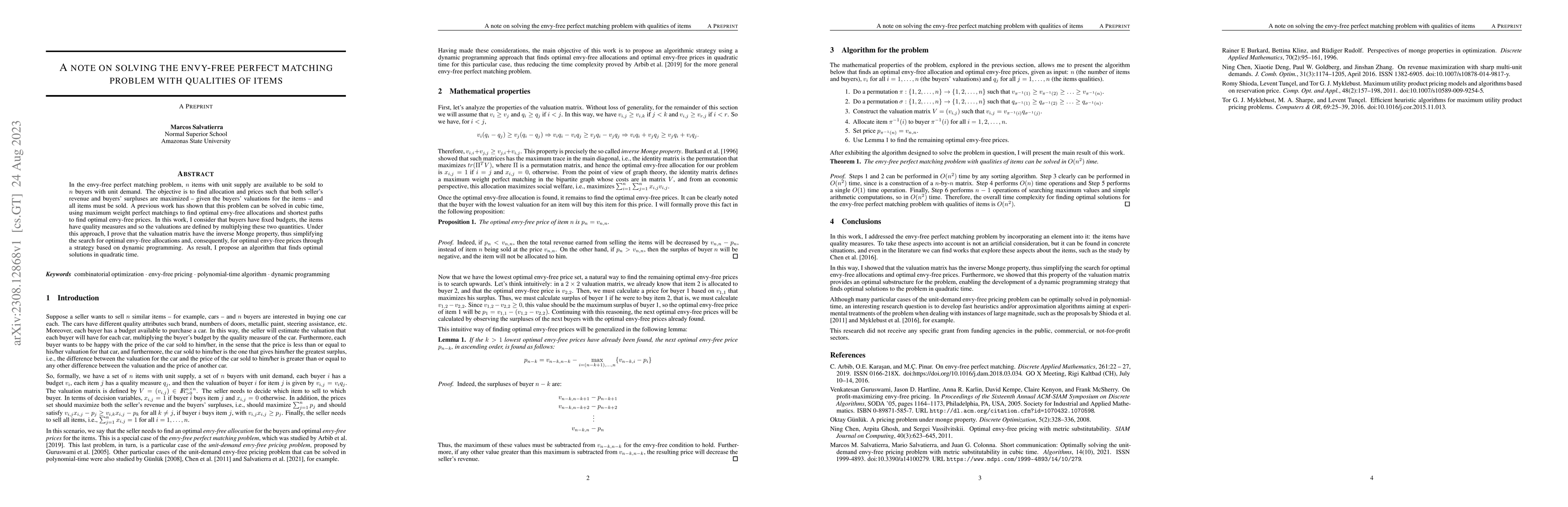 This paper addresses the envy-free perfect matching problem with item qualities, proving that the valuation matrix has the inverse Monge property. It proposes a quadratic-time algorithm based on dynamic programming to find optimal envy-free allocations and prices, improving upon the cubic-time solution.
