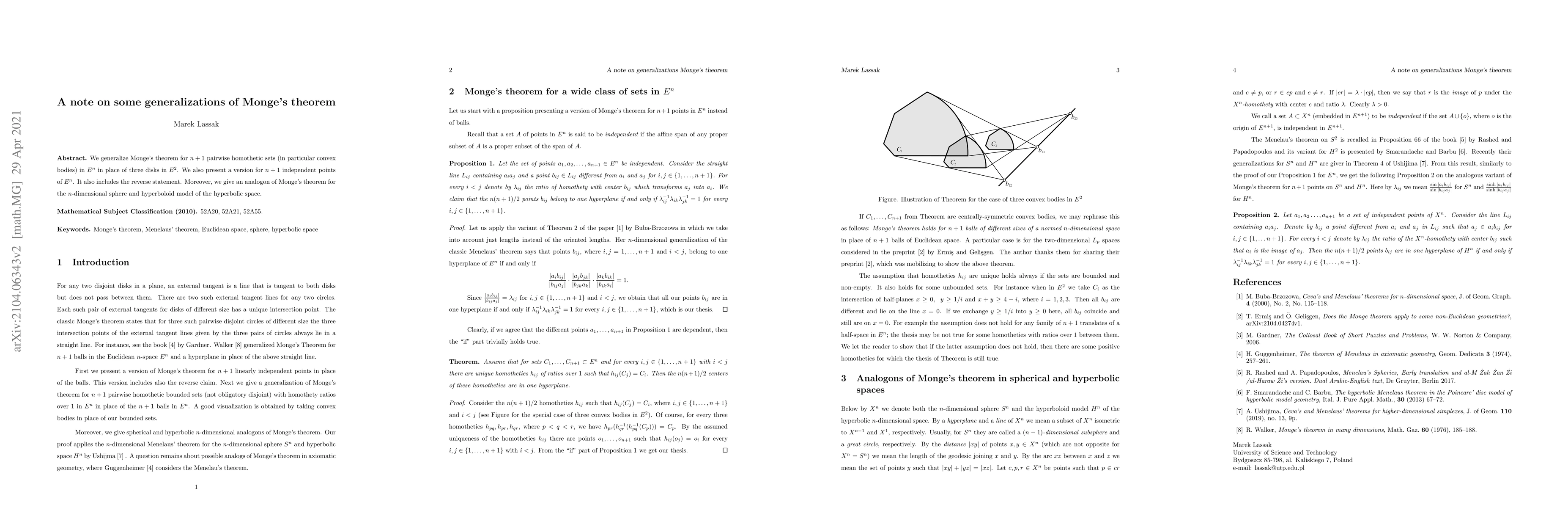 This paper generalizes Monge's theorem to $n+1$ pairwise homothetic sets in $E^n$ and independent points in $E^n$, including a reverse statement. It also extends the theorem to the $n$-dimensional sphere and hyperboloid model of hyperbolic space.