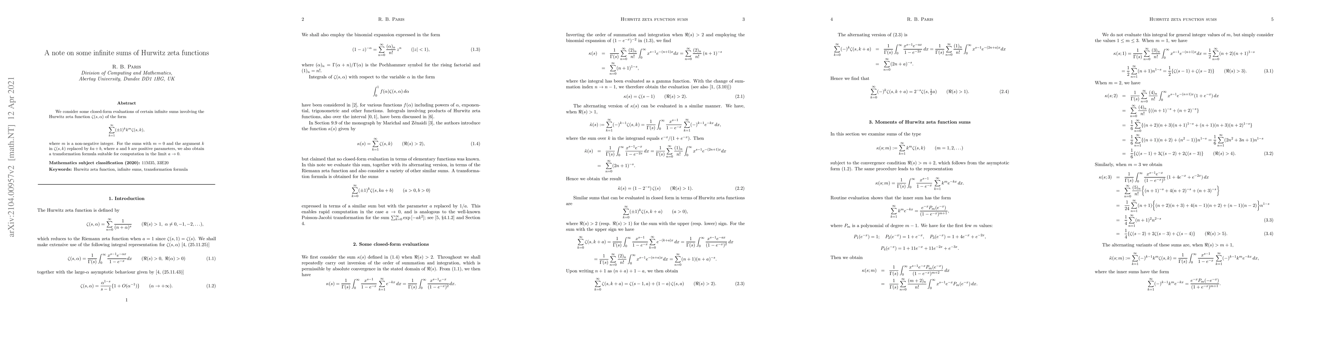 This research paper derives closed-form evaluations for infinite sums involving Hurwitz zeta functions, providing a transformation formula suitable for computation in the limit of positive parameters approaching zero.