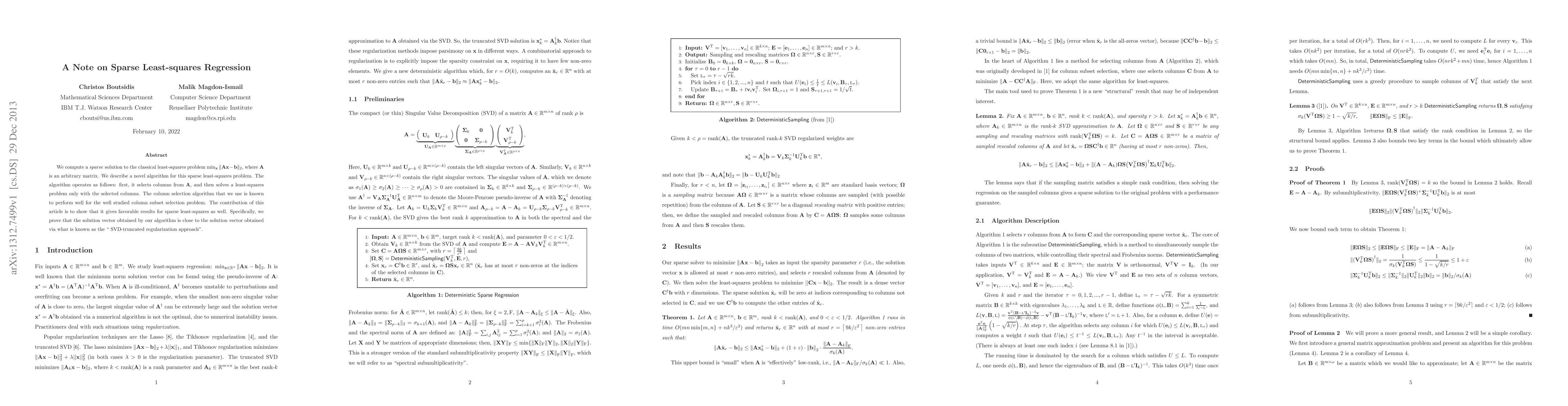 This paper proposes a novel algorithm for sparse least-squares regression, which selects relevant columns from matrix $A$ before solving the least-squares problem. The authors demonstrate that their method yields solutions close to those obtained via the SVD-truncated regularization approach.