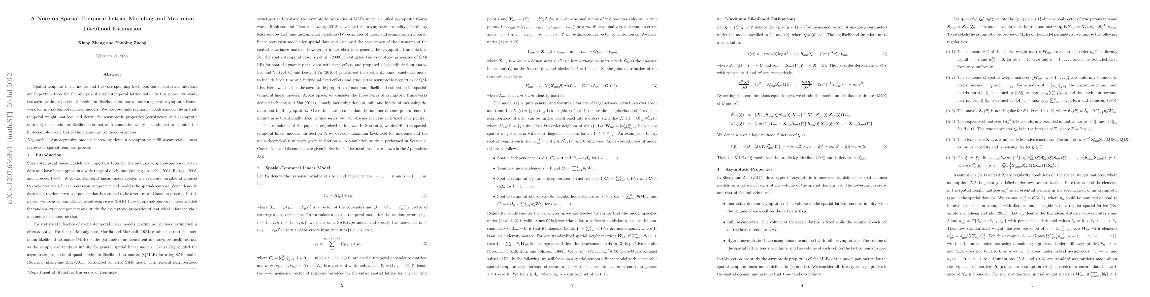 Spatial-temporal linear model and the corresponding likelihood-based statistical inference are important tools for the analysis of spatial-temporal lattice data. In this paper, we study the asymptotic properties of maximum likelihood estimates under a general asymptotic framework for spatial-temporal linear models. We propose mild regularity conditions on the spatial-temporal weight matrices and derive the asymptotic properties (consistency and asymptotic normality) of maximum likelihood estimates. A simulation study is conducted to examine the finite-sample properties of the maximum likelihood estimates.