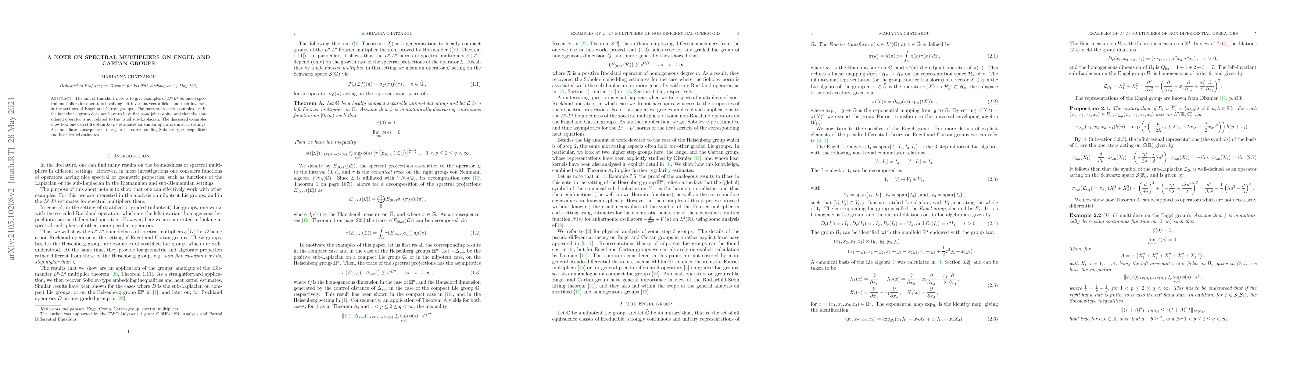 This paper provides examples of $L^p$-$L^q$ bounded spectral multipliers for operators on Engel and Cartan groups, demonstrating $L^p$-$L^q$ estimates without relying on flat co-adjoint orbits or the usual sub-Laplacian, leading to Sobolev-type inequalities and heat kernel estimates.